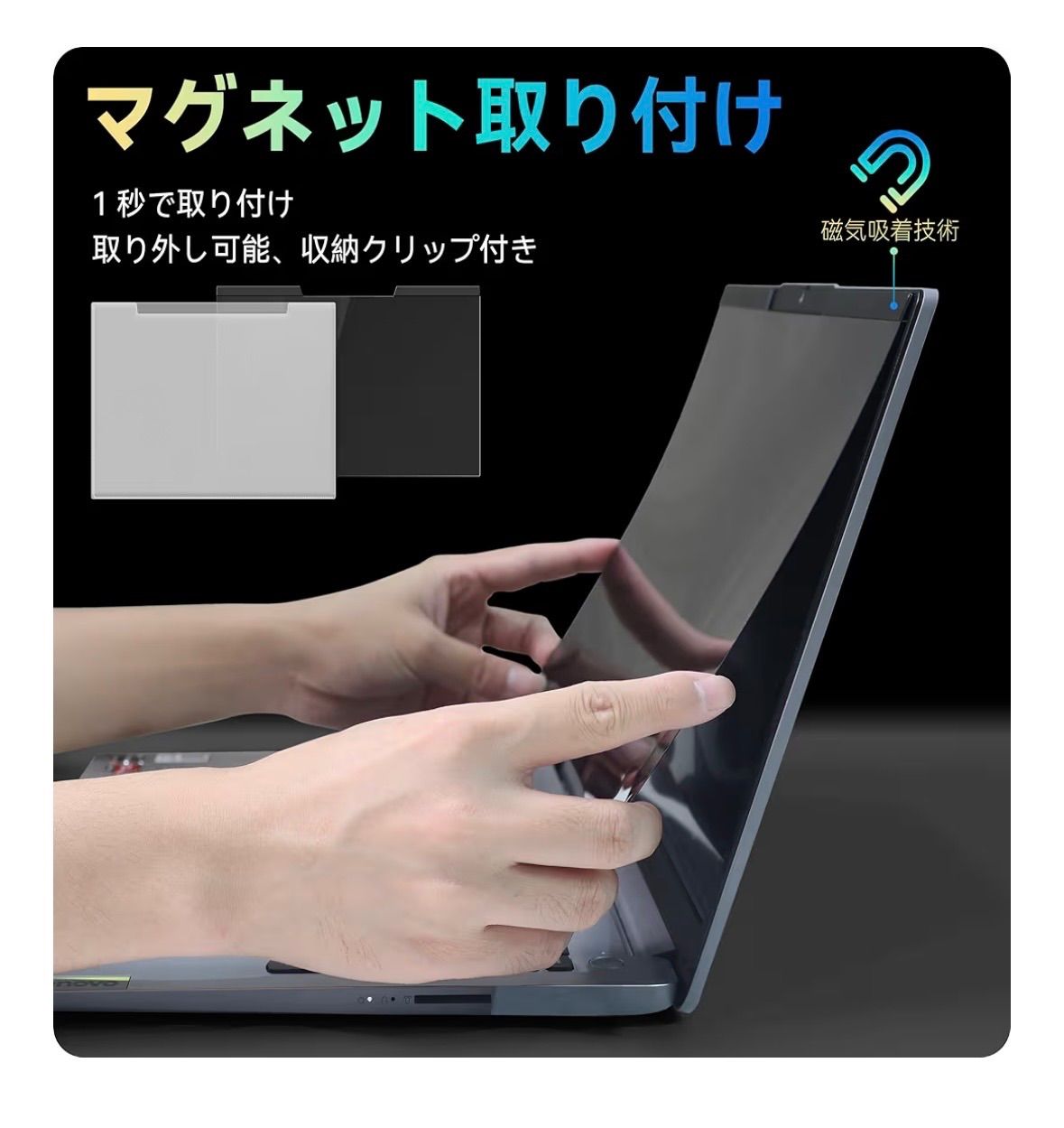 【取り付けと取り外しが簡単】磁気吸引設計プロセスにより、画面に近づけて軽く押すだけで、自動的に吸収され、取り付けが完了します。スクリーンプロテクター収納クリップが付属しており、使用しないときは取り外して収納クリップに入れ、ノートパソコンと一緒にコンピューターバッグに収納できます。いつでもどこでも着脱でき、すべてがとても簡単です。
