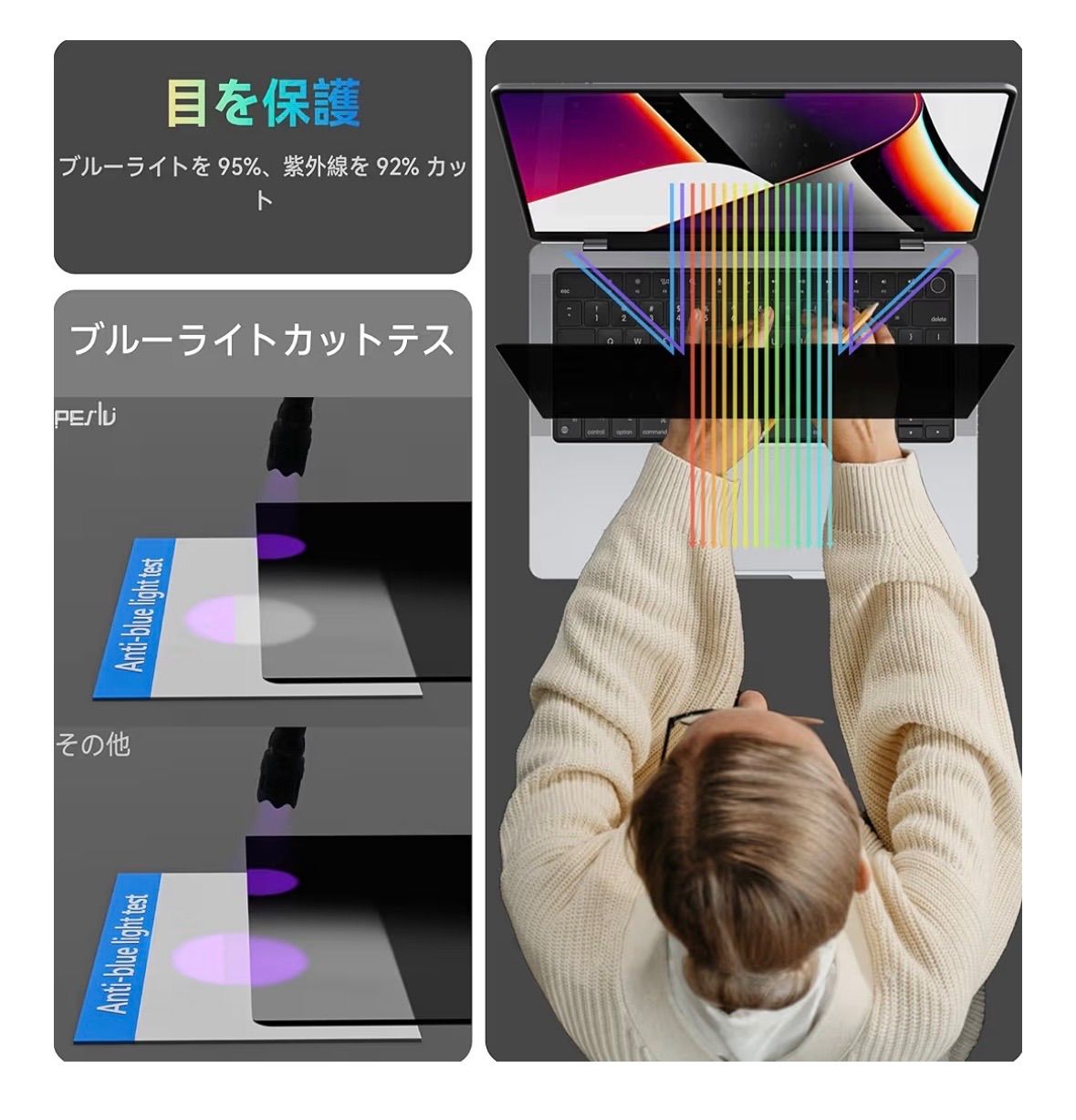 【画面と目を保護】日本製の高品質素材とドイツから輸入したプロセスにより、13インチの磁気ノートパソコンプライバシースクリーンの性能が大幅に向上しました。高品質のフィルター層で、ブルーライトを95%、紫外線を92%カットします。マットな表面、アンチグレアで、反射光を95%効果的に遮断します。日常使用による傷を防ぐ傷防止層。視力を保護しながら画面を保護します。