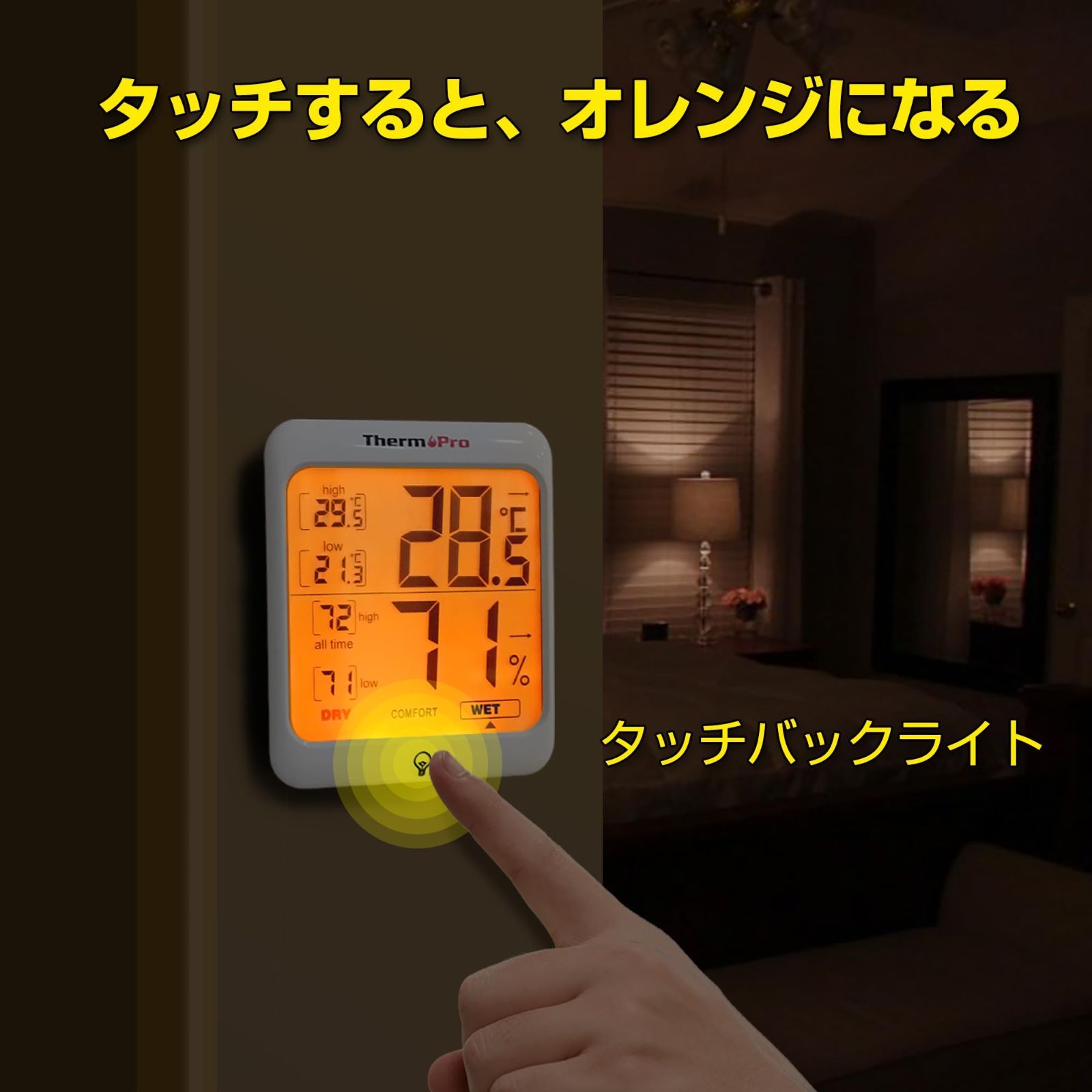 【タッチバックライト付き】デジタル温湿度計はバックライト機能があるから、薄暗い所でも設定と読むのは便利になります。