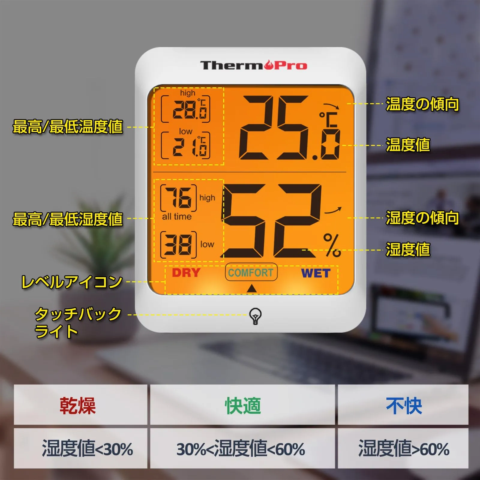 【快適レベル表示】温度・湿度計は「乾燥、快適、不快」の3段階で快適レベルを表示するので一目で分かりやすいです。防水仕様ではないです。