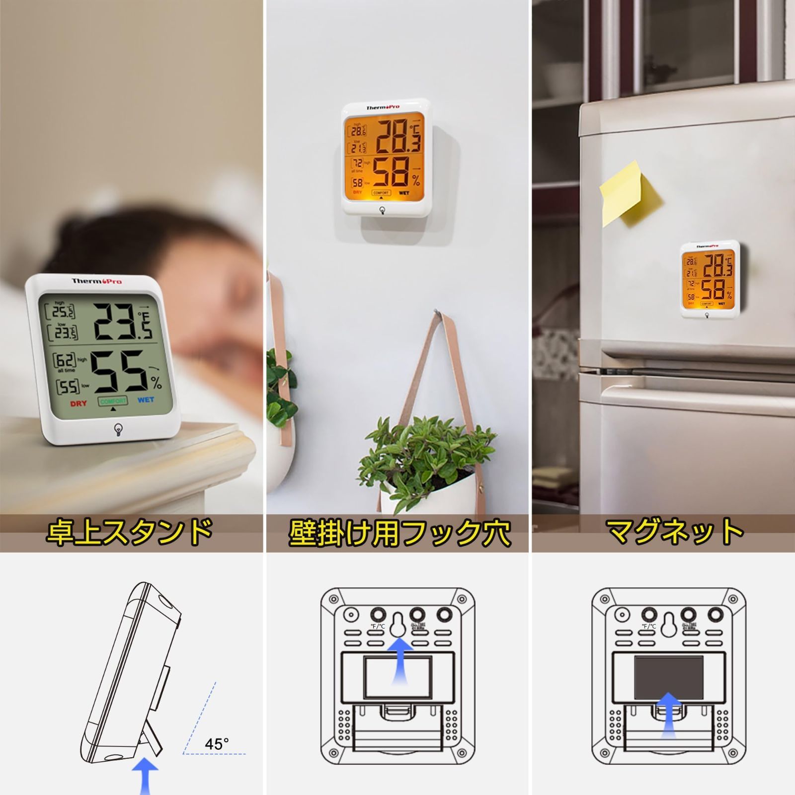 【三つの設置方法】室内温度湿度計は卓上スタンド・マグネット・壁掛け用フック穴が付いているので、自宅の様々な場所に設置出来ます。単四電池(1.5V)が含まれます。
