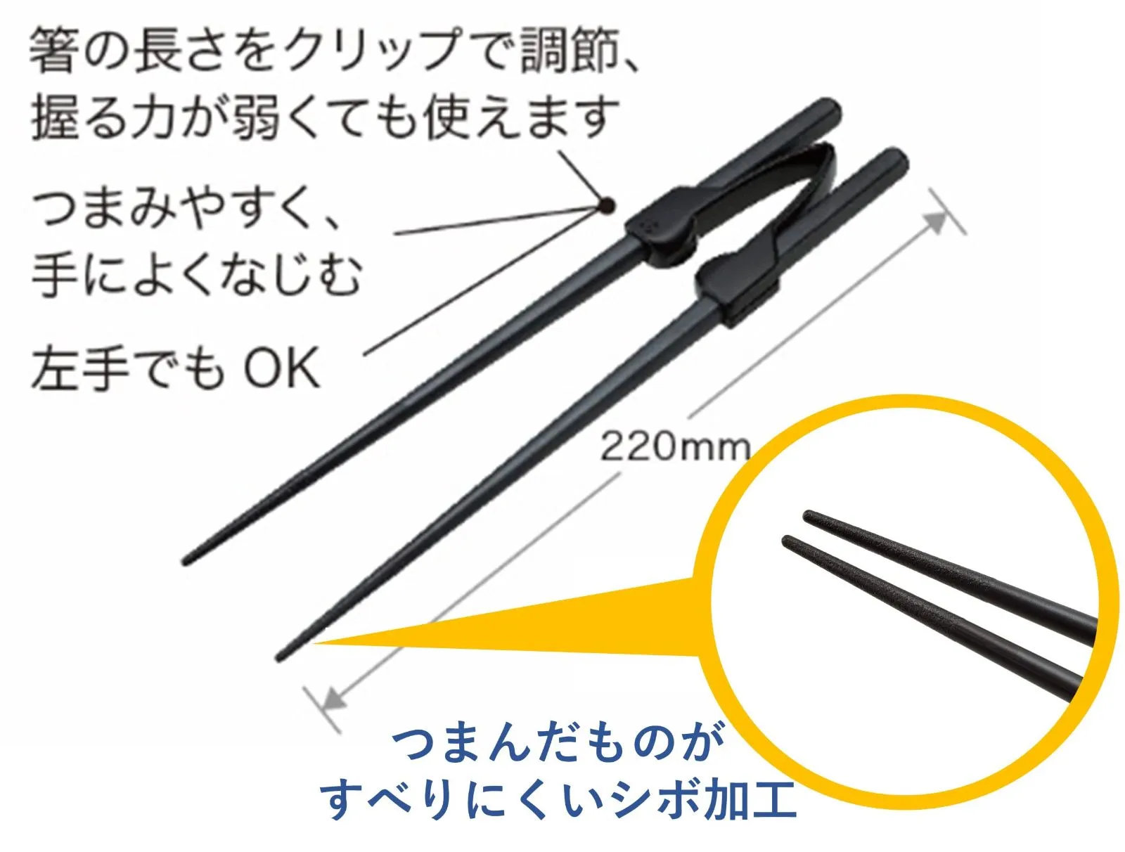 ●箸先を合わせるクリップ付きなので、握力が弱まったり細かい作業が不自由な方にもお使いいただけます。