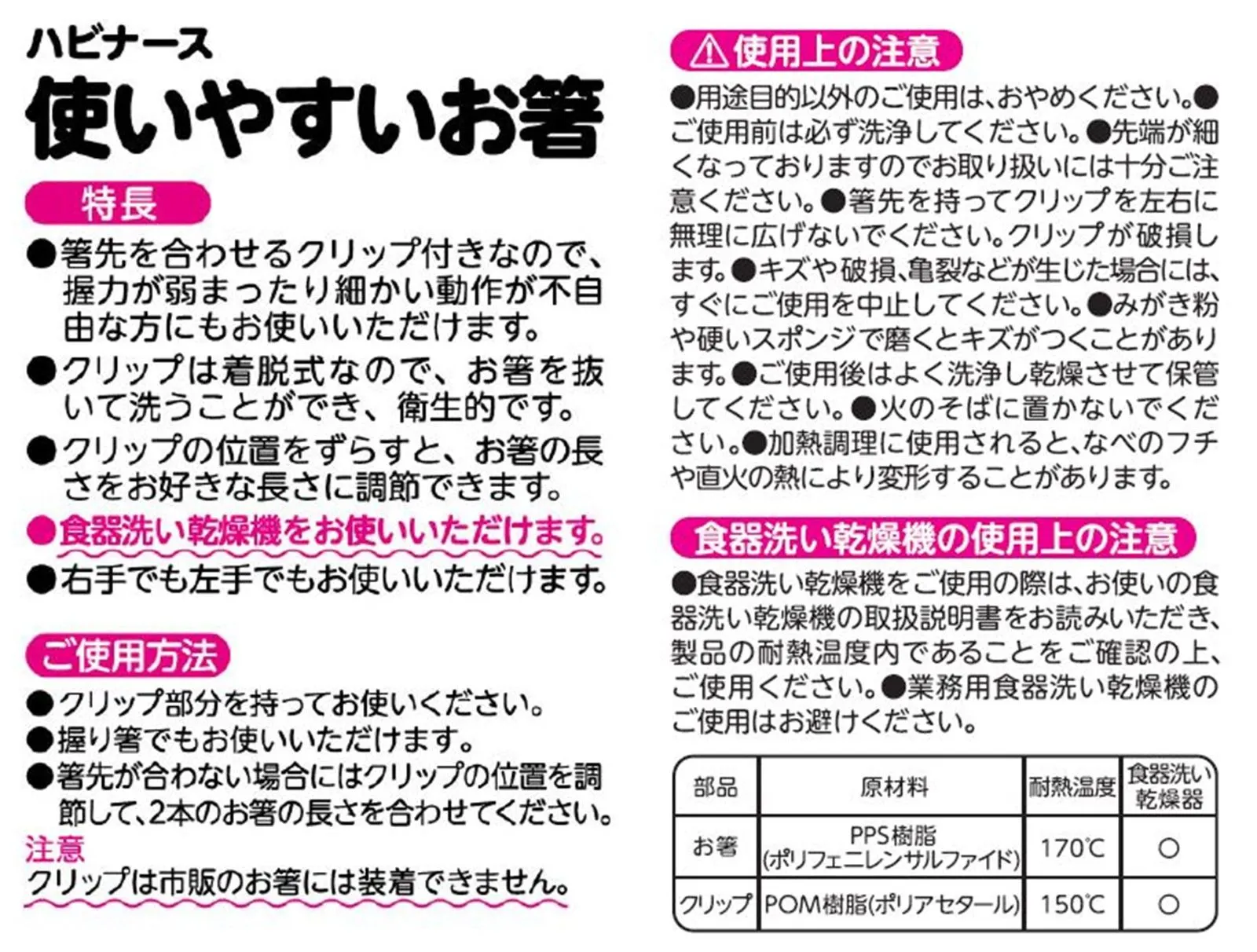 ●材質/箸部分:PPS樹脂、クリップ部:ポリアセタール