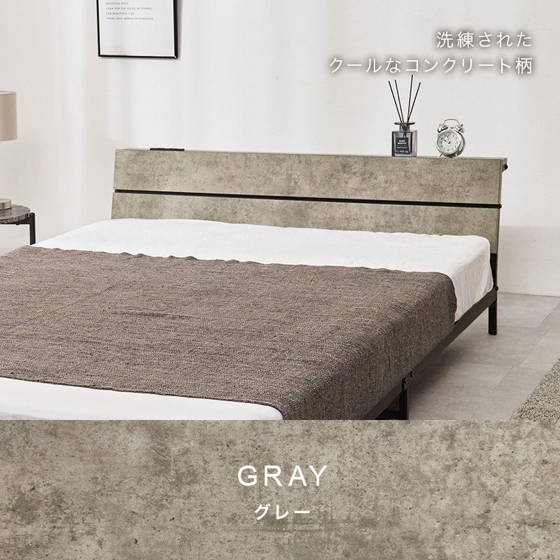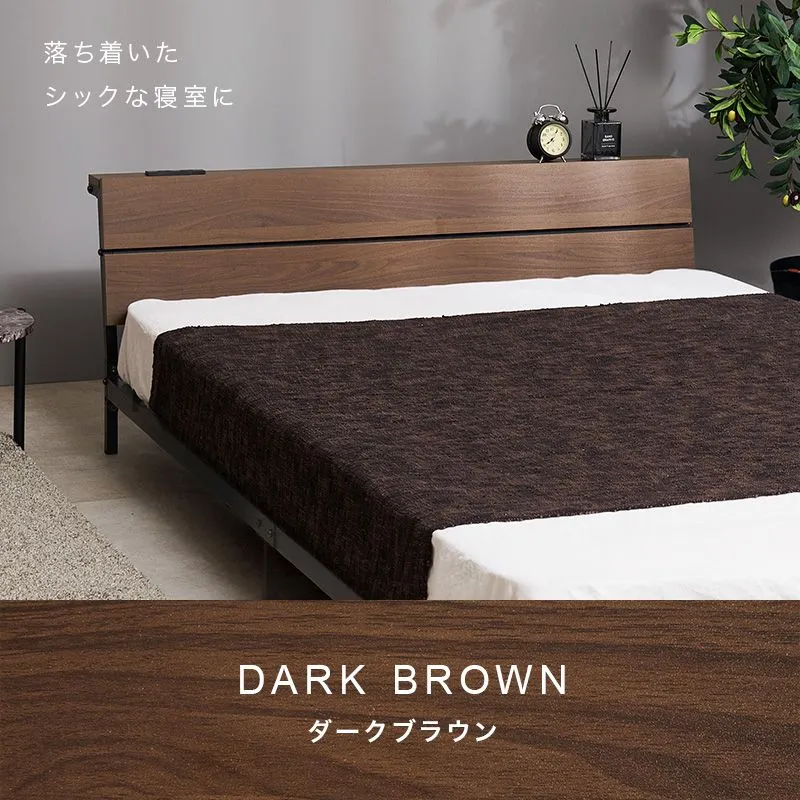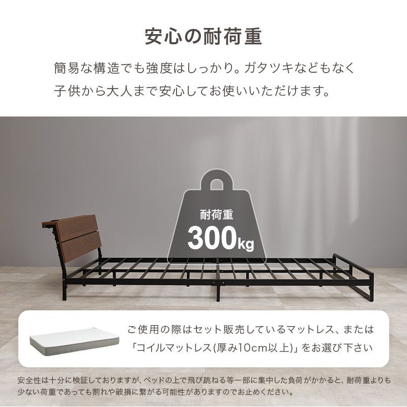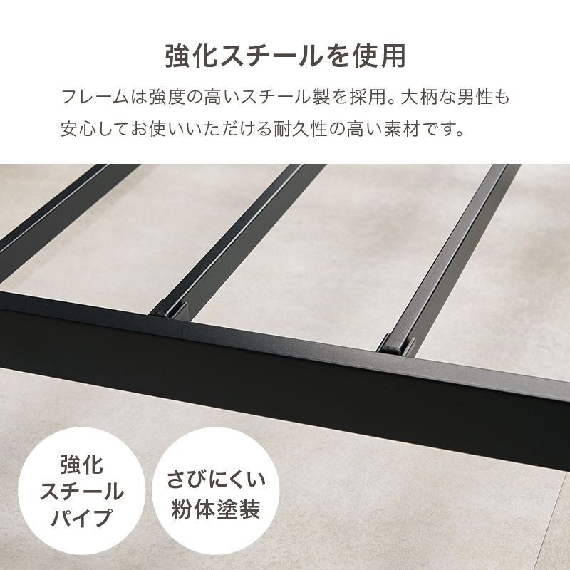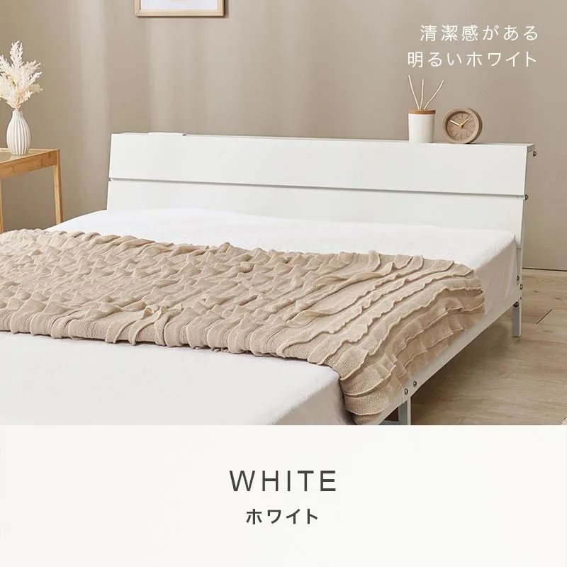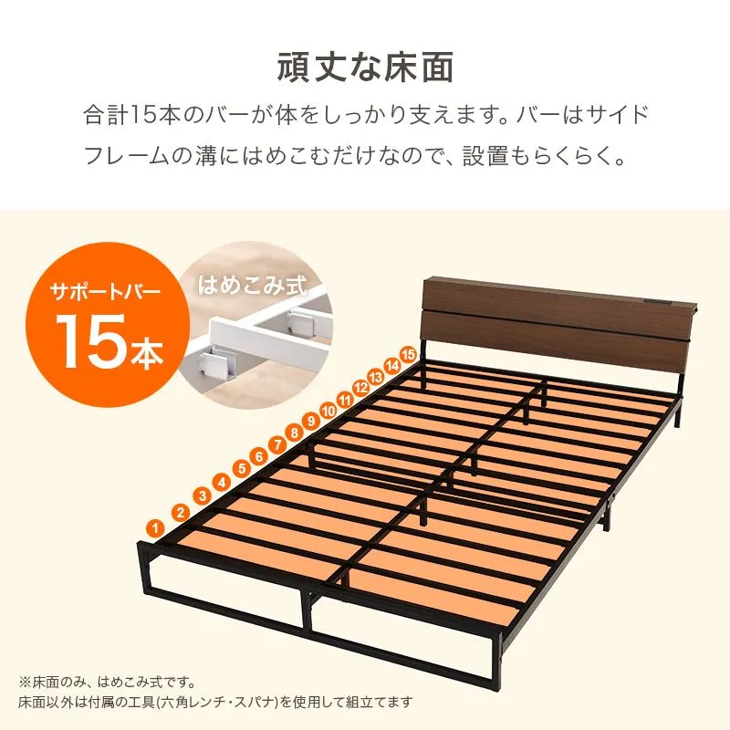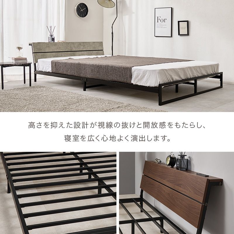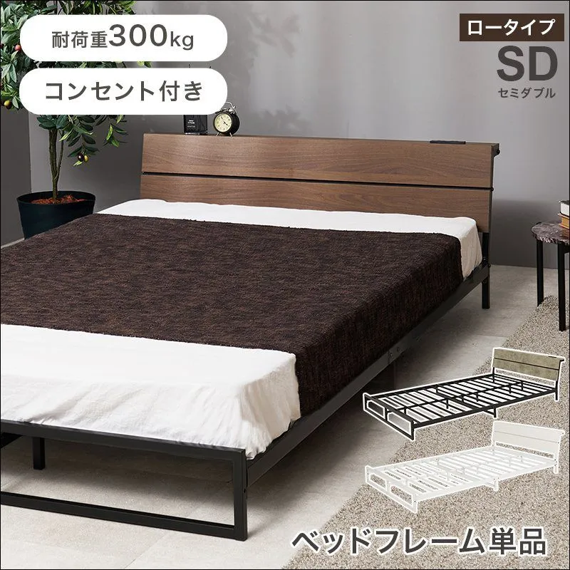 スチールフレームでスッキリとした印象のセミダブルベッド。ロータイプ設計なので寝室を広く心地よく演出します。便利な2口コンセント付き