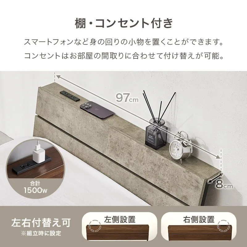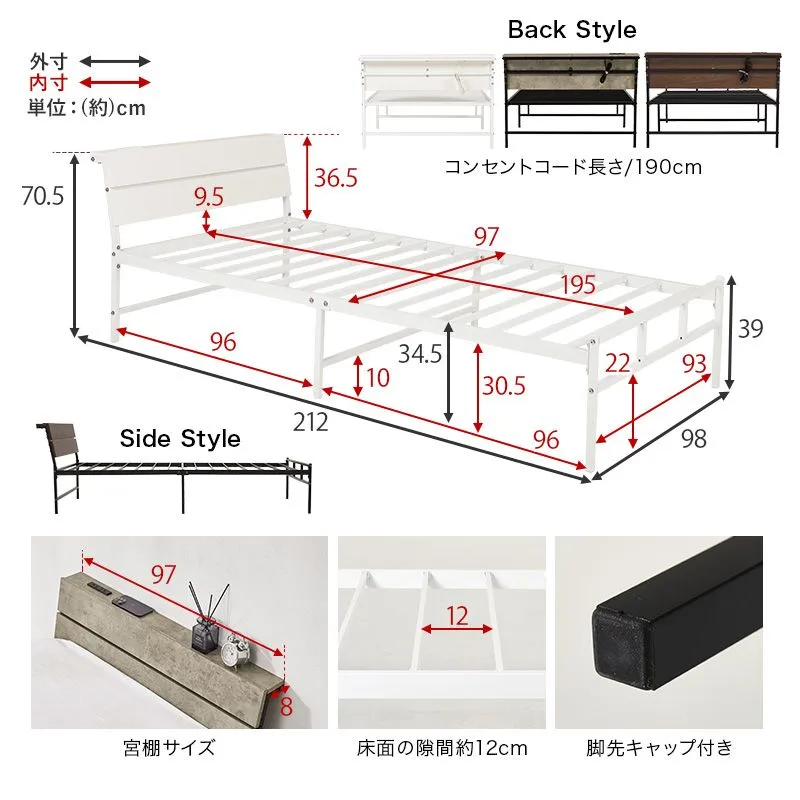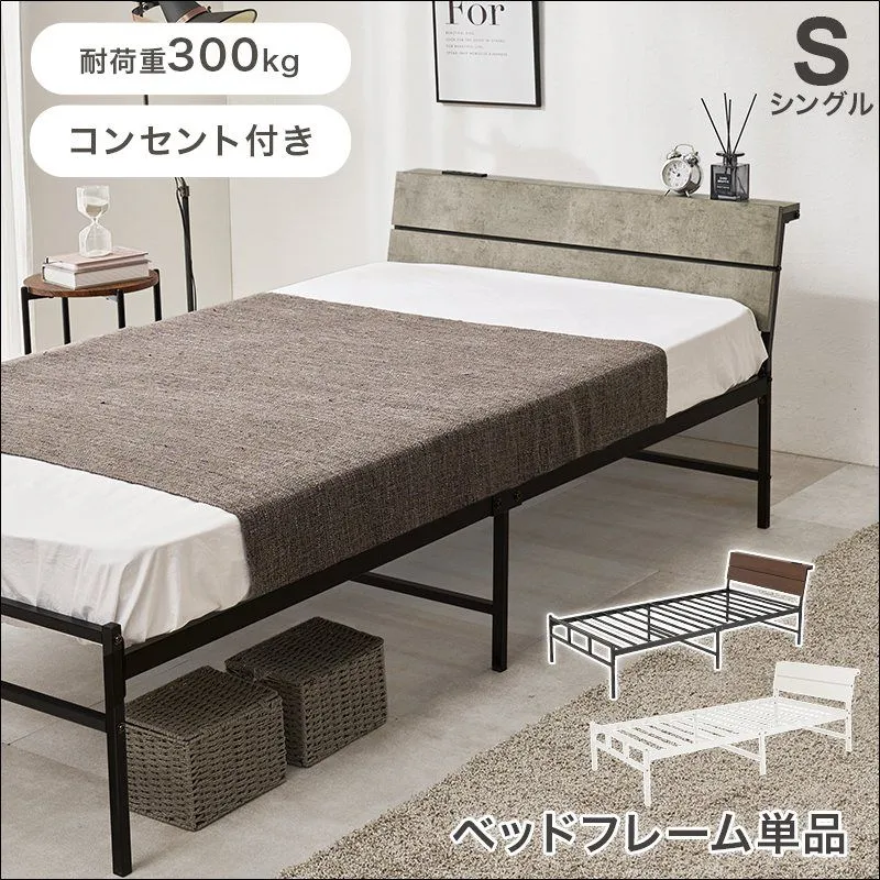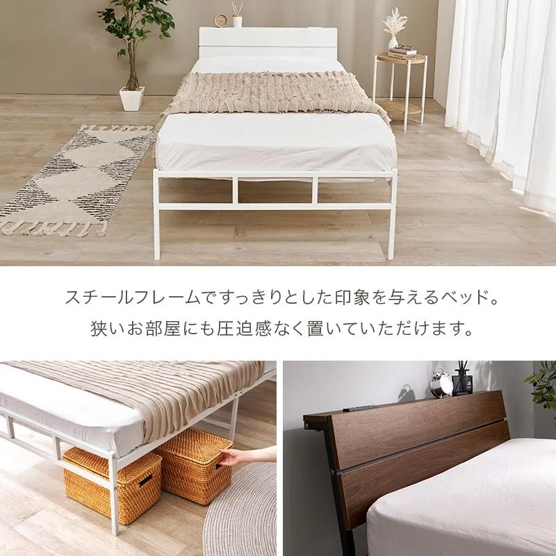 スチールフレームでスッキリとした印象のシングルベッド。ヘッドボードは傾斜があるパネル仕様です。便利な2口コンセント付き