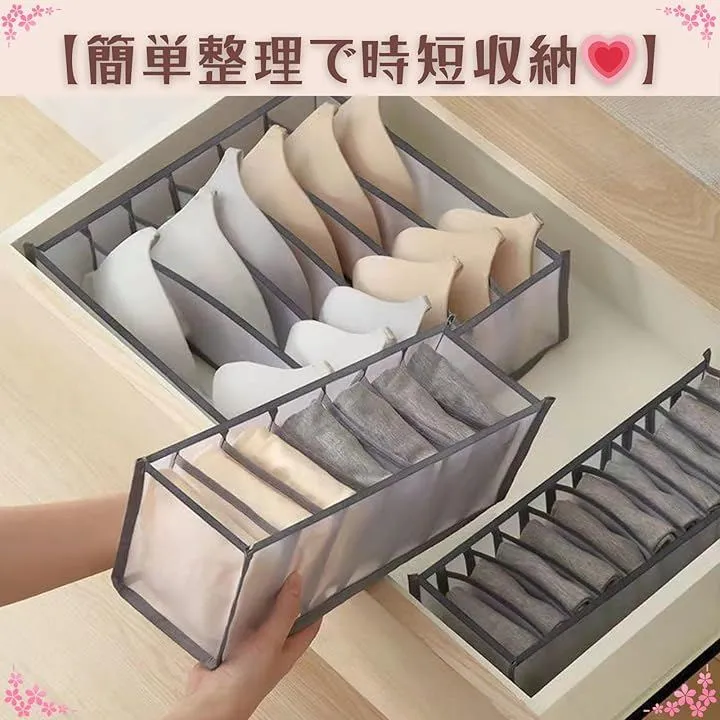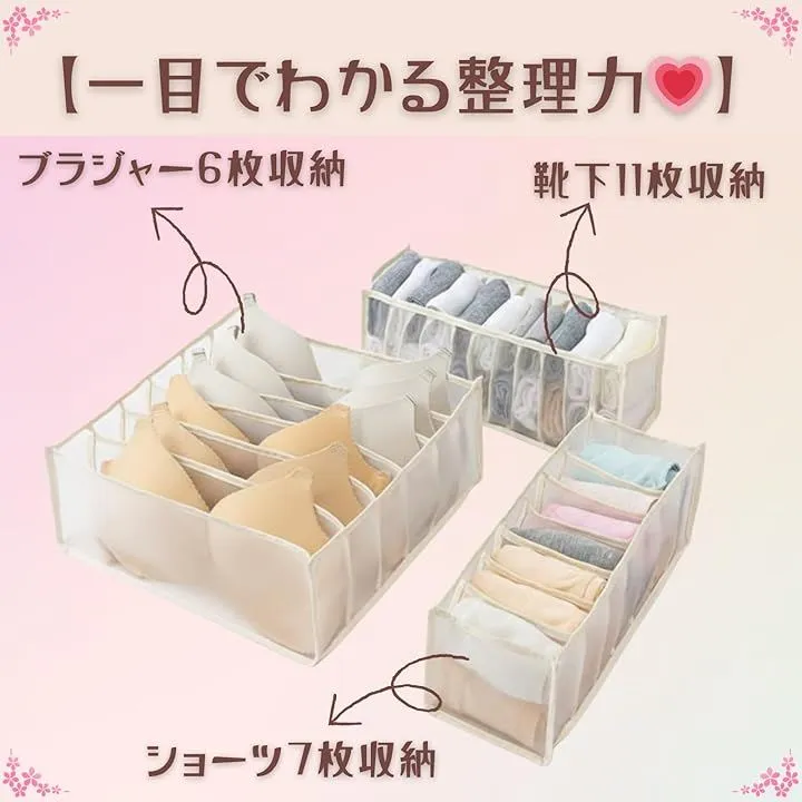 ショーツ・ブラ・靴下を種類ごとに分けて収納でき、引き出し内のごちゃつきを防ぎ、毎日の取り出しやすさが大幅に向上します。