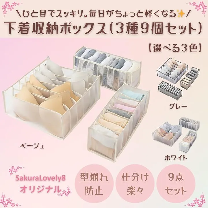 カラーはホワイトとベージュの2色、ショーツ用3個・靴下用3個・ブラ用3個の合計9点セットで、多用途に使える便利な構成です。