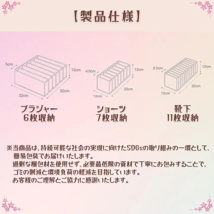 「製品仕様」ショーツ用12x12x32cm、靴下用12x12x32cm、ブラ用32x12x32cm。
