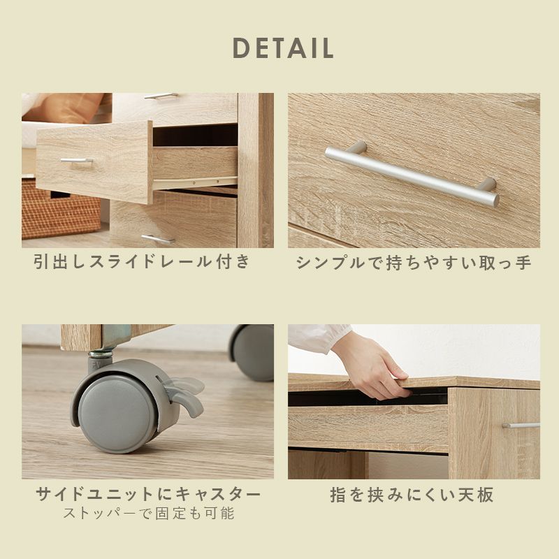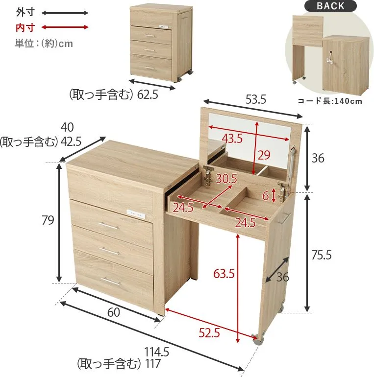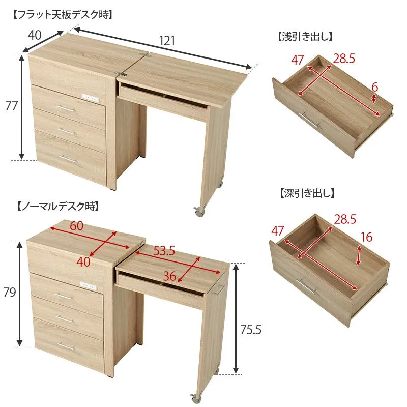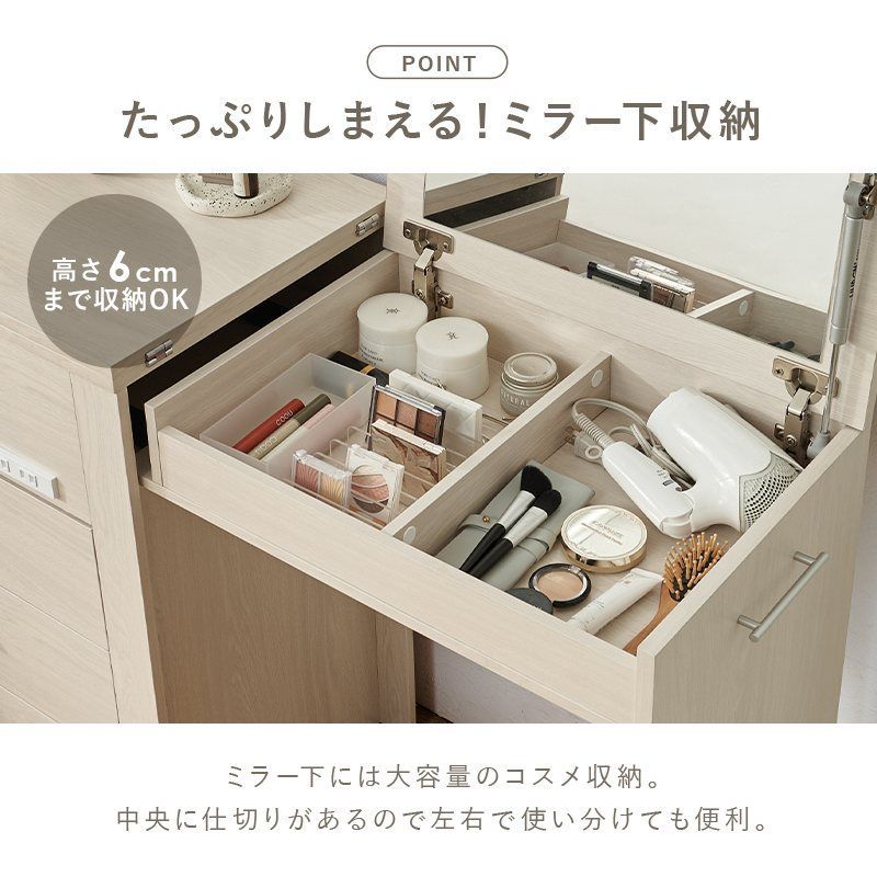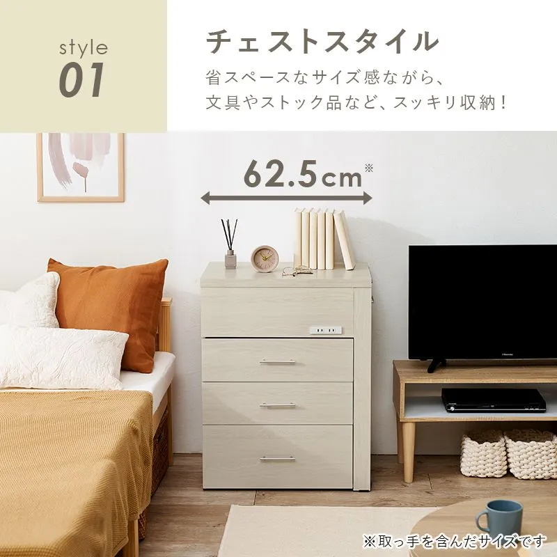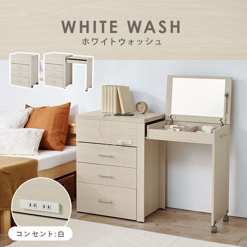チェスト、デスク、ドレッサーと3タイプに変形し、ドレッサー部分はコンパクトに収納できるのでお部屋のスペースを有効活用できます。2口コンセント付きでヘアセットやパソコン作業にも便利。