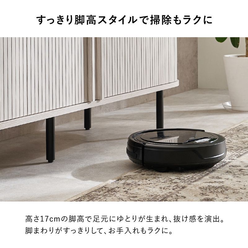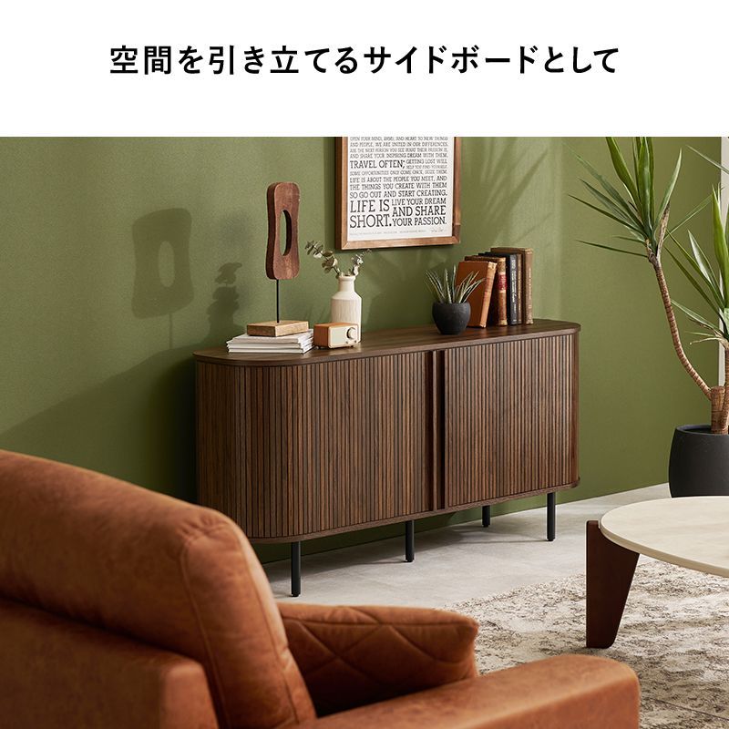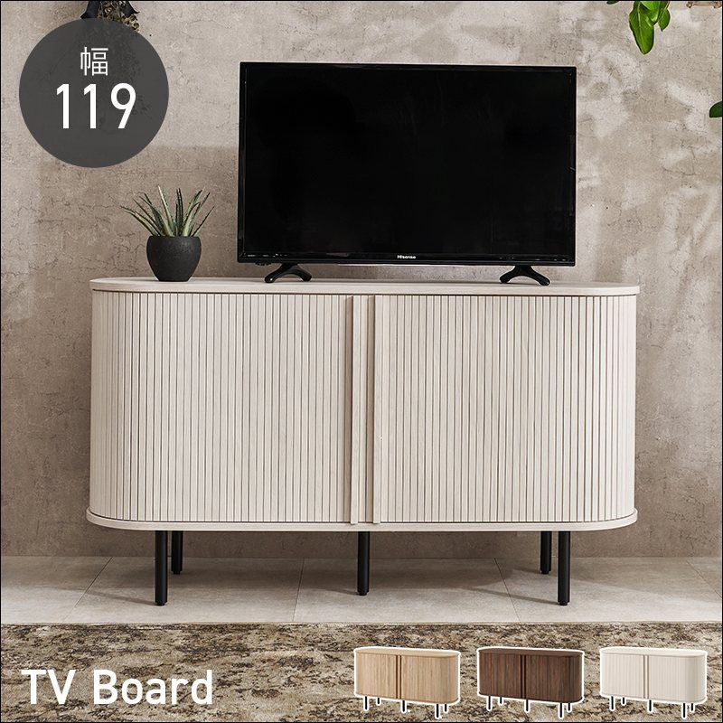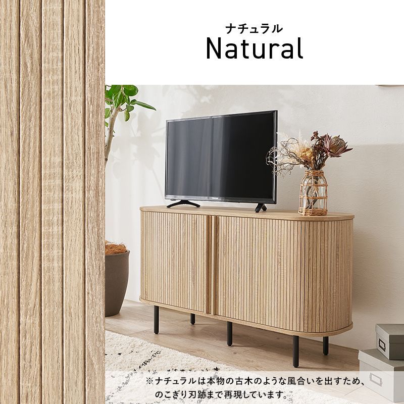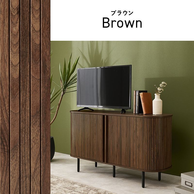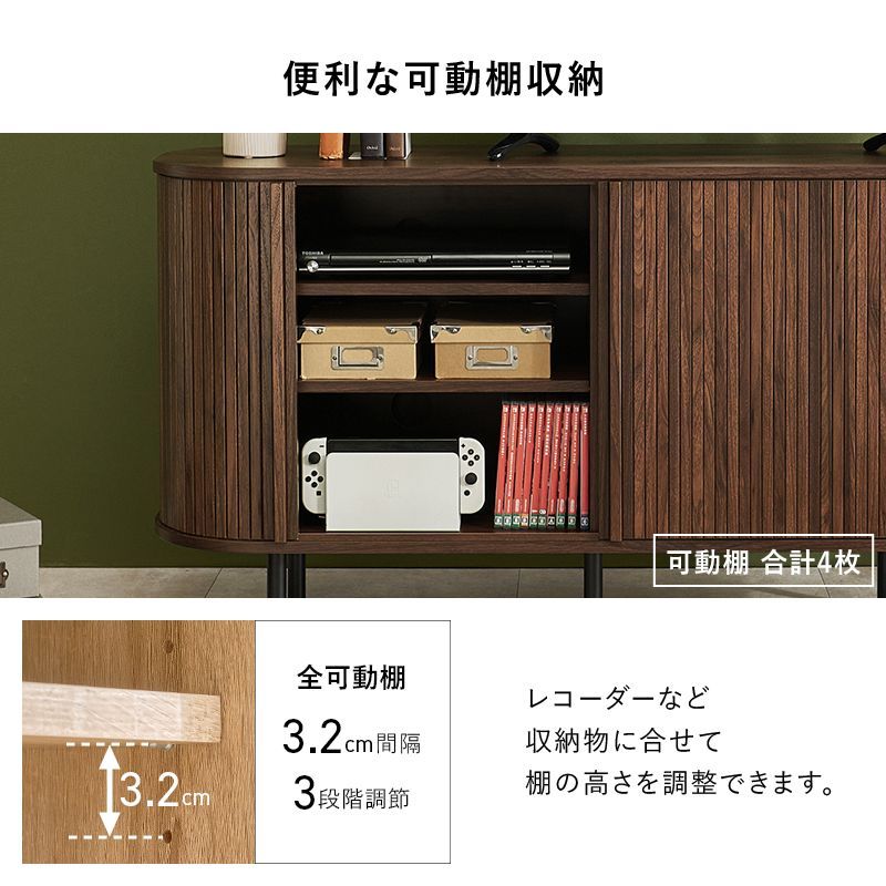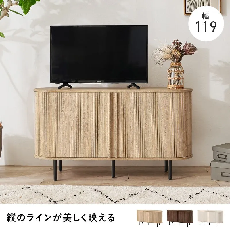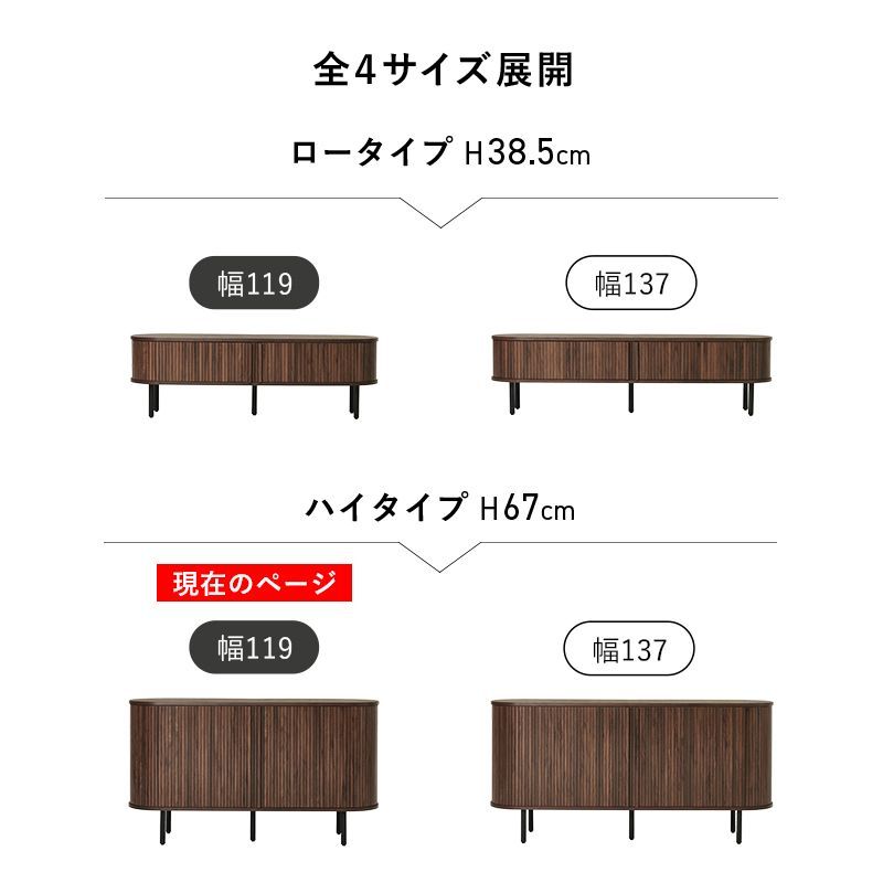 縦のラインとサイドの曲線が美しいタンブール扉のハイタイプテレビ台。扉の開閉に場所を取らず、すっきりとした脚高デザインもポイントです。サイドボード、キャビネット収納としても使用可能