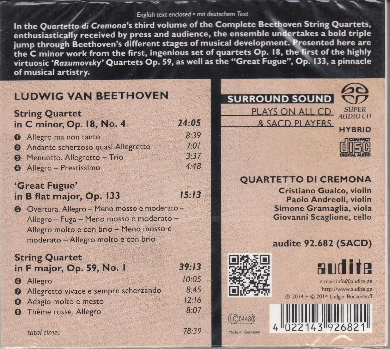 SACDハイブリッド盤。今やイタリアを代表するクァルテット、クレモナ四重奏団。AUDITEレーベルからリリースを続けている好企画、ベートーヴェンの弦楽四重奏曲全集の第3集は、弦楽四重奏曲第4番、名曲『大フーガ』、そして弦楽四重奏曲第7番です。
