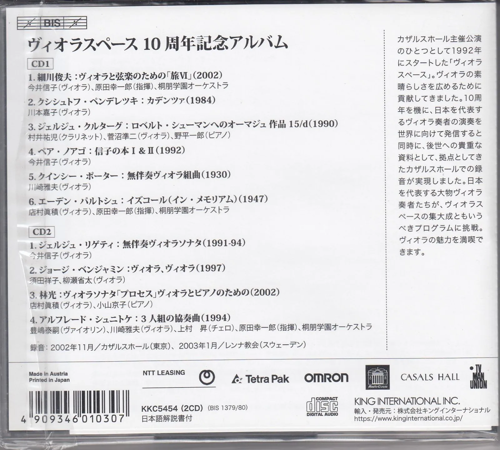 カザルスホール(現在閉館)主催公演のひとつとして1992年にスタートした「ヴィオラスペース」。ヴィオラの素晴らしさを広めるために貢献してきました。このディスクは2002年に10周年を迎えた際に、今井信子、川崎雅夫、店村眞積など日本を代表するヴィオラ奏者の演奏を世界に向けて発信するため、BISがカザルスホールで録音したものです。リゲティの『無伴奏ソナタ』や細川俊夫の作品を今井信子が、林 光の作品やユダヤ色濃厚なパルトシュを店村眞積がとりあげているのも注目。演奏はもちろん極上で、ヴィオラの魅力を満喫できます。