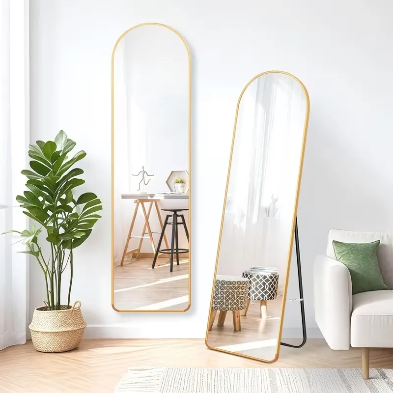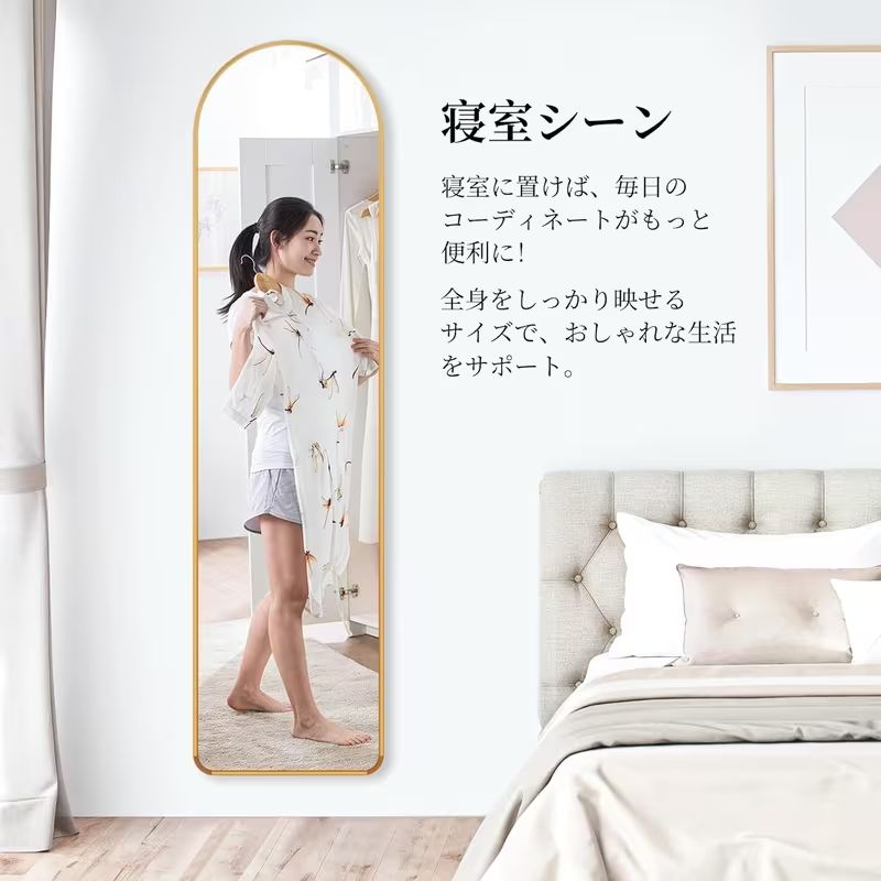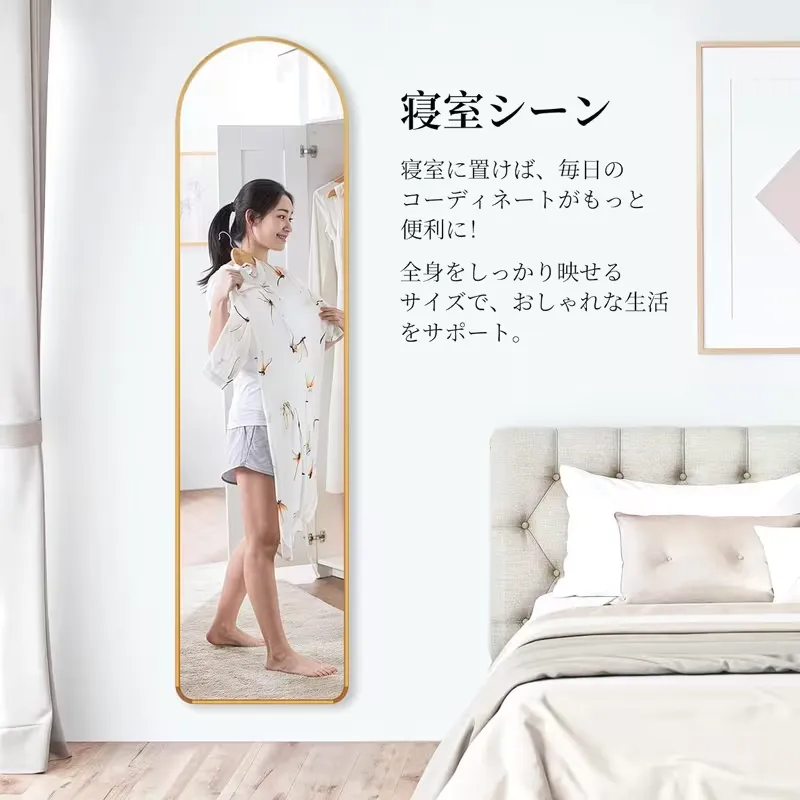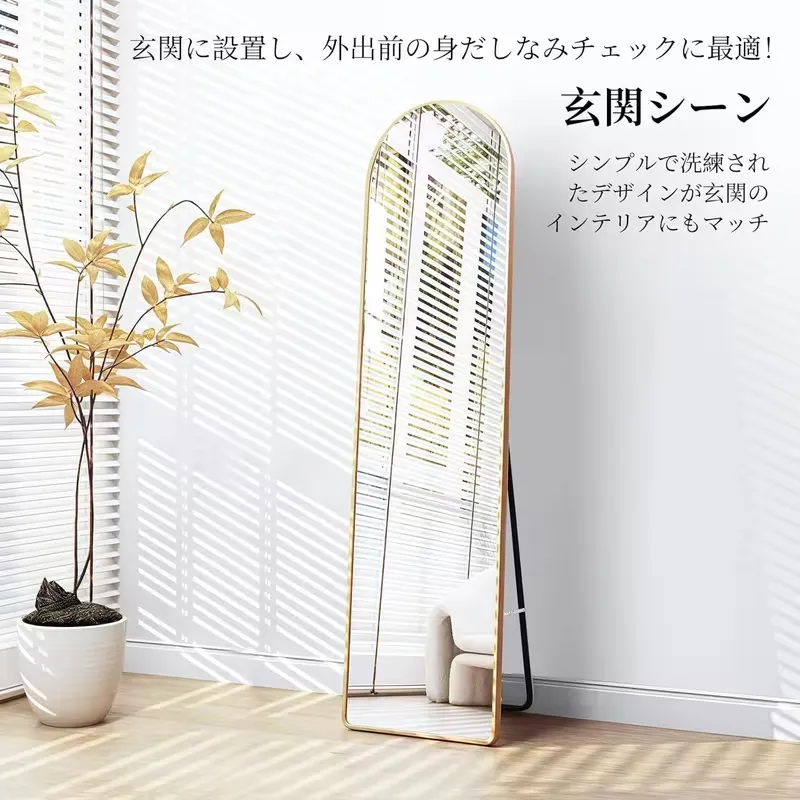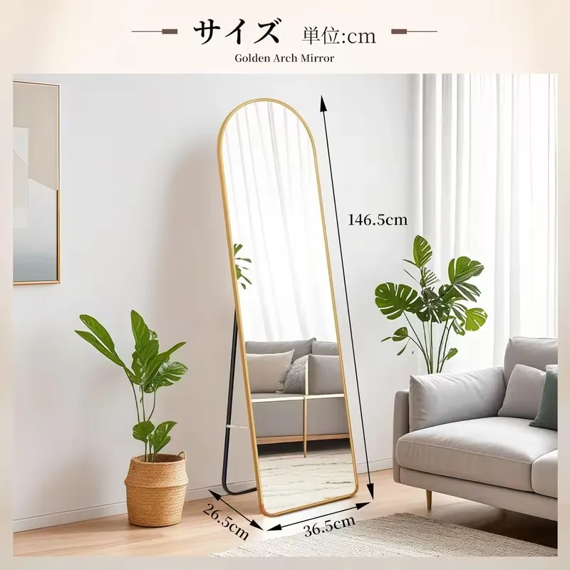 【現代的なアーチ型デザイン】この全身鏡は、スタイリッシュでモダンなアーチ型デザインを採用し、アルミ合金の超薄型フレームが特徴です。どんな部屋にも溶け込むシンプルで洗練されたデザインは、リビングや寝室、ドレッシングルームに最適です。空間に調和をもたらし、部屋全体の雰囲気を引き立てます。