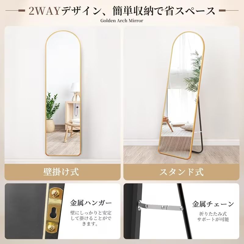 【2WAY使用可能】壁掛け鏡としても、スタンドミラーとしても使える便利な2WAY仕様。狭い部屋やアパートでも、フレキシブルに使用可能で、空間を有効活用できます。スタンドミラーとして自立させることができ、壁掛け鏡としても使え、用途に応じた使い方ができます。