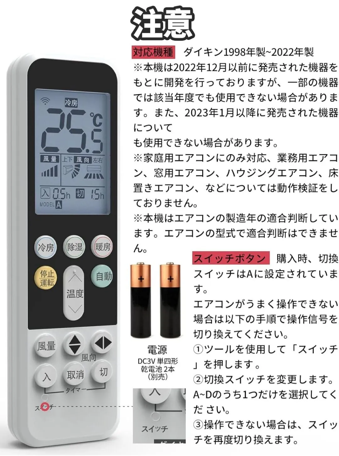 【対応機種】ダイキンエアコン 1998年製~2022年製 ※本機は2022年12月以前に発売された機器をもとに開発を行っておりますが、一部の機器では該当年度でも使用できない場合があります。また、2023年1月以降に発売された機器について も使用できない場合があります。 ※家庭用エアコンにのみ対応、業務用エアコン、窓用エアコン、ハウジングエアコン、床置きエアコン、などについては動作検証をしておりません。 ※本機はエアコンの製造年の適合判断しています。エアコンの型式で適合判断はできません。