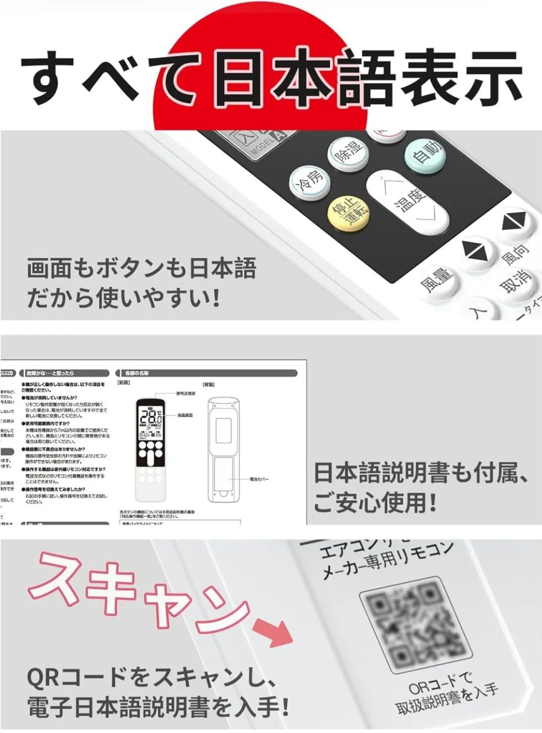 【全て日本語表示】使いやすいように、このエアコン用リモコンのボタン配置、ディスプレイ、付属の説明書はどれも日本語表示です。詳しい日本語説明書付。リモコンの機能や操作手順がすぐに分かり、ストレスなく使うことができます。