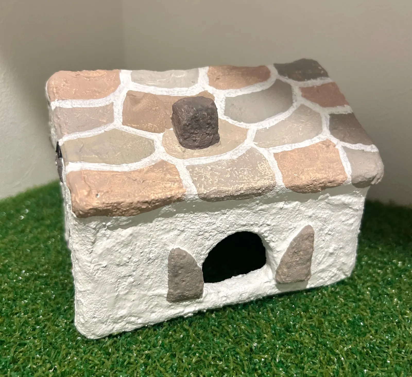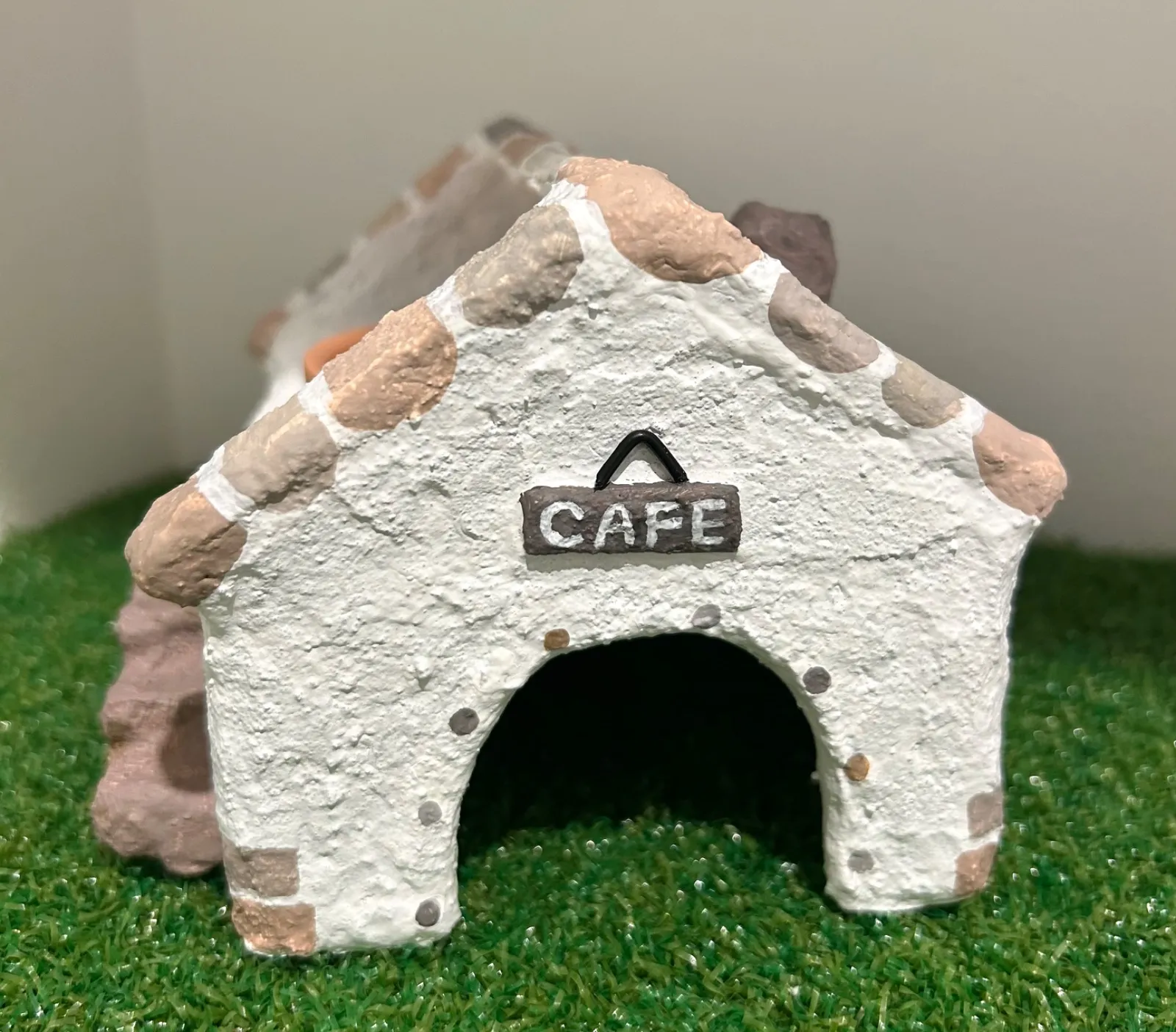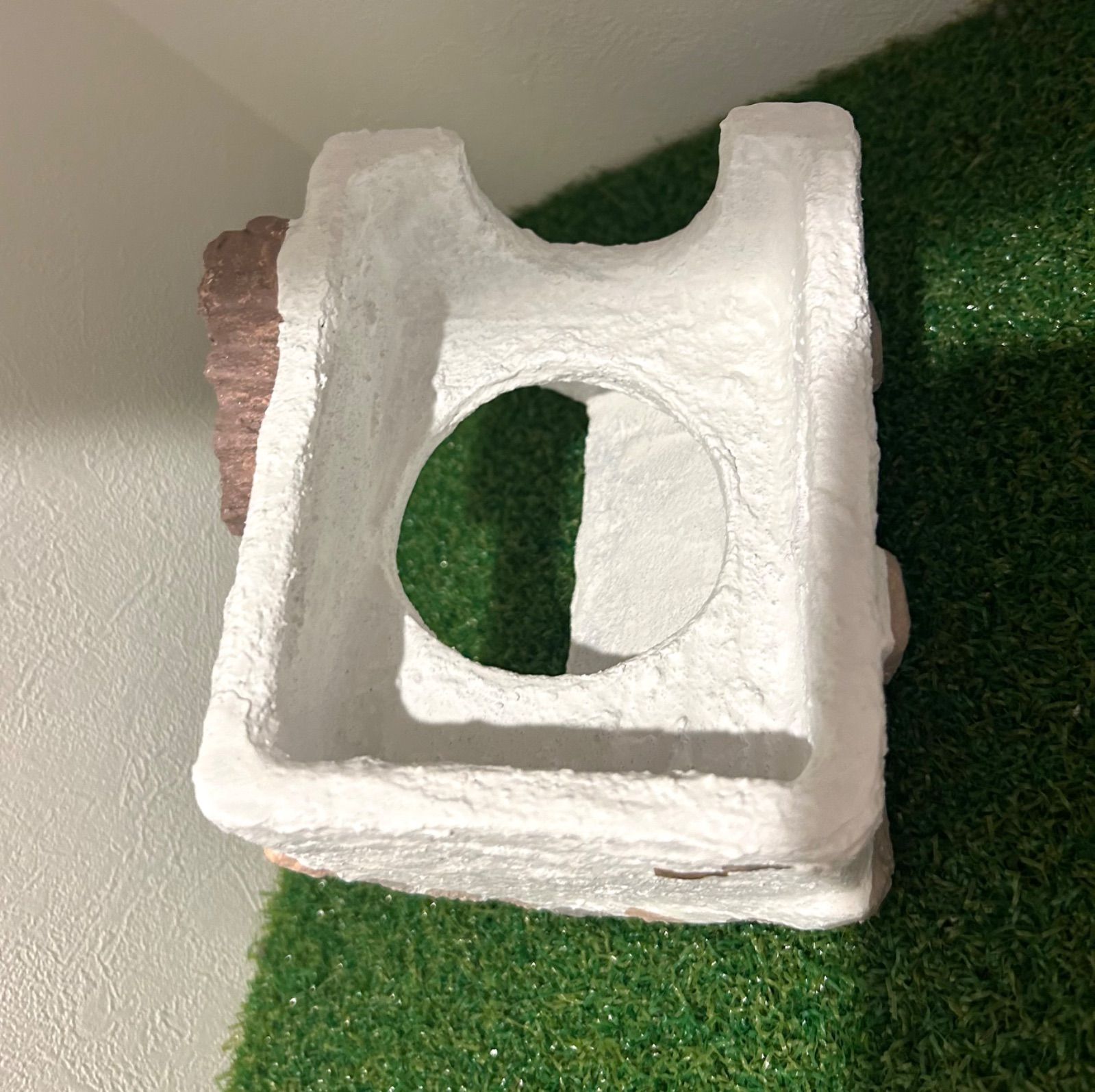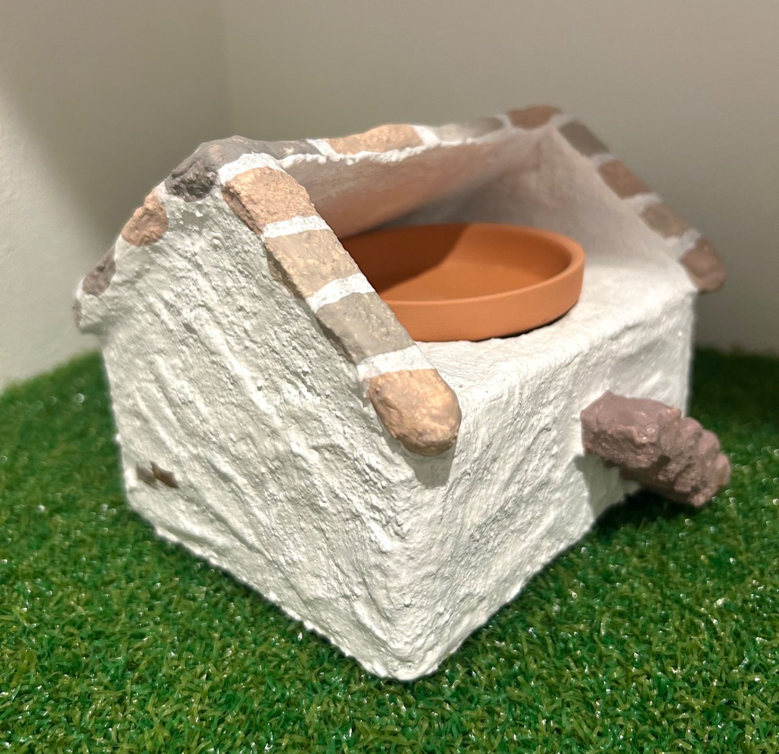 モルタルの上に安全性の高い多用途塗料を塗り、仕上げにミルクペイントで色付けをしています。シェルターの表面をミルク原料のみで作られたペイントで全体を塗っているので爬虫類が舐めてしまっても安心です。
