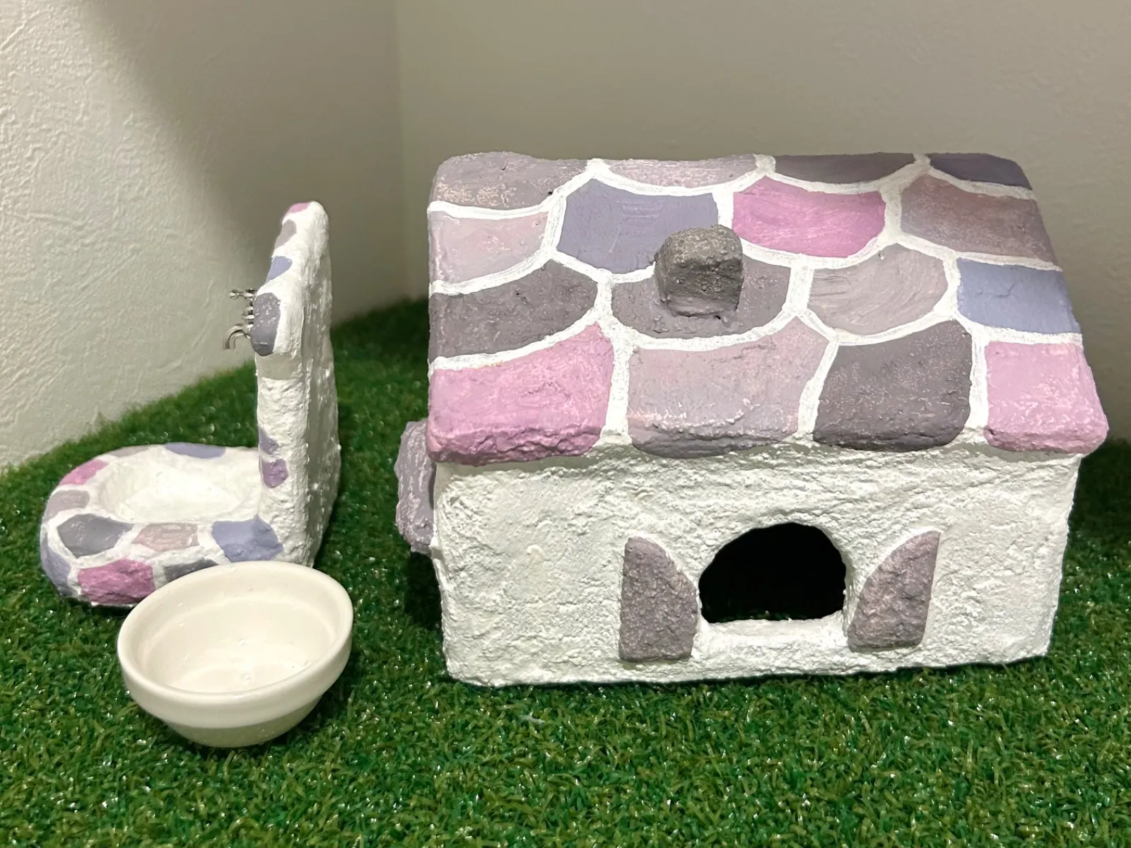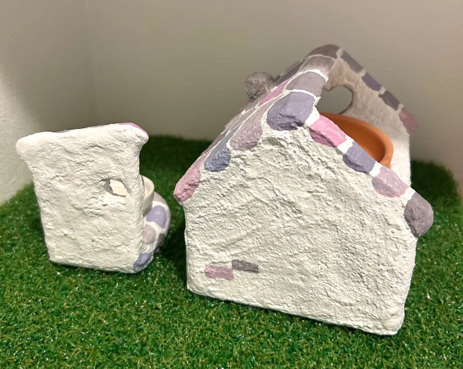 モルタルの上に安全性の高い多用途塗料を塗り、仕上げにミルクペイントで色付けをしています。シェルターの表面をミルク原料のみで作られたペイントで全体を塗っているので爬虫類が舐めてしまっても安心です。