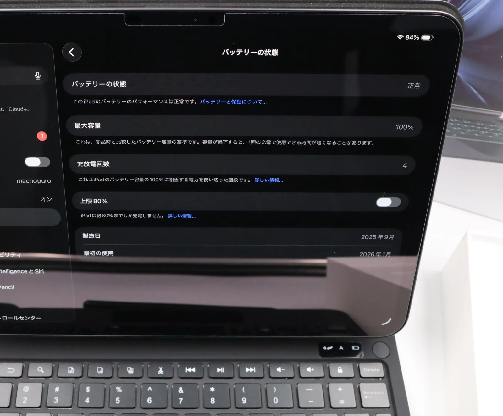 2026/1/8に購入し、初期設定後は使用していないため満充電回数は4回です。
