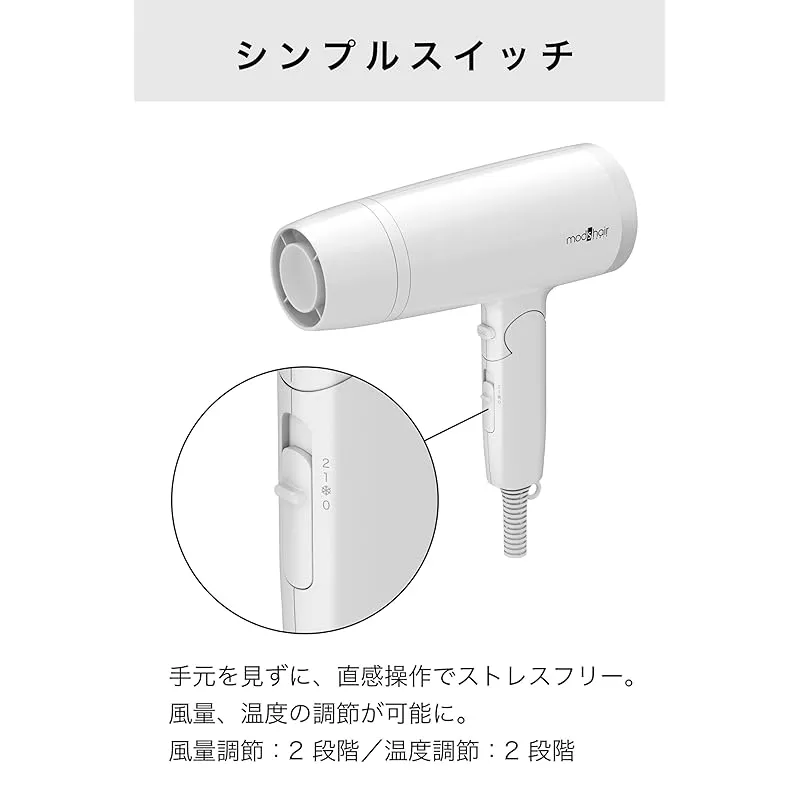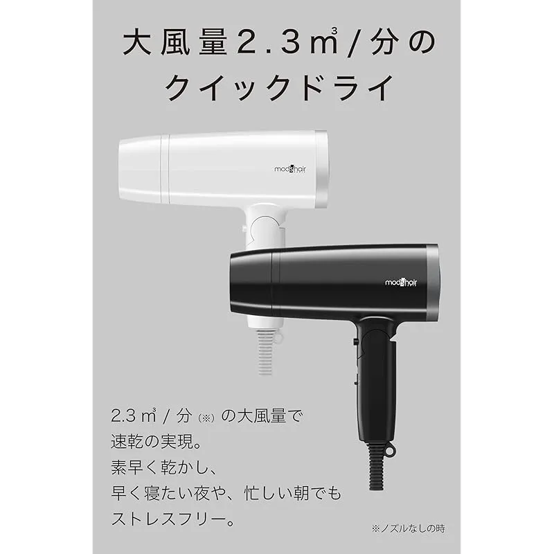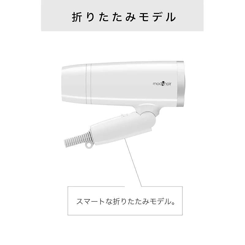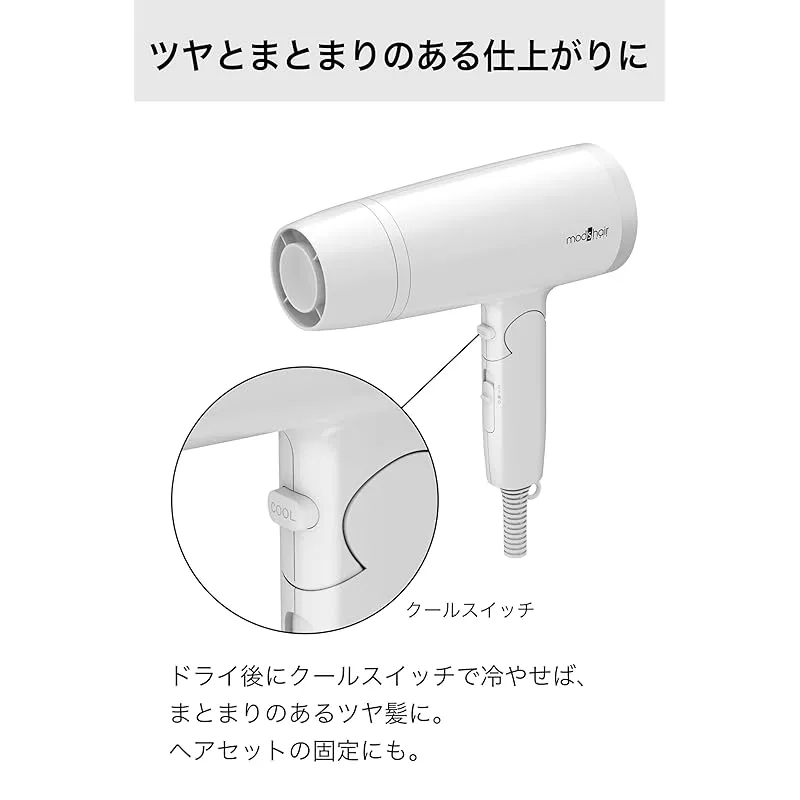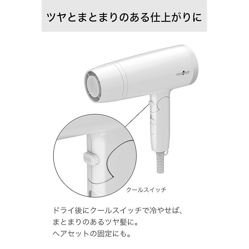モッズヘアの「スタイリッシュマイナスイオンヘアードライヤー」は速乾性が従来品より110%アップ!大風量2.3?/分の力強い風とクイックドライノズルでより素早い乾きを実現したヘアドライヤーです。この速乾ドライヤーなら忙しい朝や、早く寝たい夜もストレスフリーに。さっと乾いて、さらっとまとまる、シンプルながら使い心地抜群の大風量のヘアドライヤーです。 モッズヘアの「スタイリッシュマイナスイオンヘアードライヤー」の新型ノズルは従来品よりも広い面を乾かせるように。ロングヘアも絡まず、心地よく乾かせるようになりました。ストレスフリーでツヤのある仕上がりを実現する、シンプル&大風量のドライヤーです。 モッズヘアの「スタイリッシュマイナスイオンヘアードライヤー」は押すだけで切り替わる簡単操作のCOOLスイッチ付き。 ドライ後にCOOLスイッチでしっかり冷やせばキューティクルが整い、速乾ドライヤー一台でさらっとまとまりのある髪に仕上がります。スタイルの固定にも使えます。 モッズヘアの「スタイリッシュマイナスイオンヘアードライヤー」はシングルスイッチ採用。直観的操作で誰でもストレスなく使用できます。大風量×直観的操作のヘアドライヤーで毎日のヘアケアがもっと快適に! モッズヘアの「スタイリッシュマイナスイオンヘアードライヤー」は風量/2段階(1/2)、風温/2段階(HOT/COOL)の調節が可能。速乾も、髪にやさしい乾かし方も一台で叶うドライヤーです。 モッズヘアの「スタイリッシュマイナスイオンヘアードライヤー」はシンプルながら高級感のあるデザインに仕上げました。毎日の生活に溶け込む、普段使いに最適な速乾ドライヤーです。 モッズヘアの「スタイリッシュマイナスイオンヘアードライヤー」は持ち手の部分が折りたためるから収納も省スペース。速乾タイプのドライヤーながら、スリムで収納しやすいデザインに設計しました。