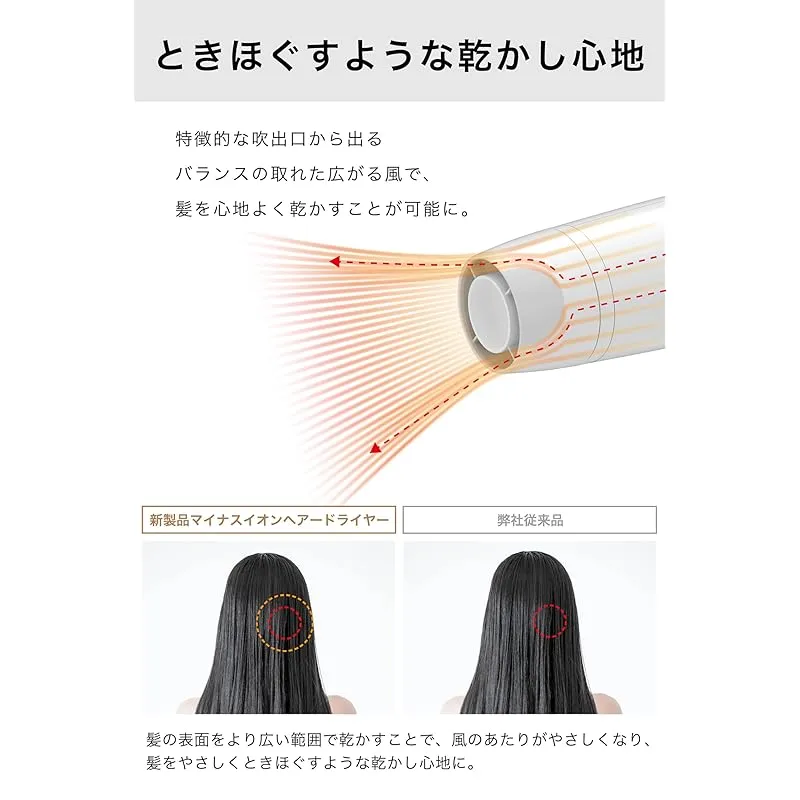 【新型ノズルでロングヘアも心地よく乾かせる速乾ドライヤー】新型ノズルにより従来品よりも広い面を乾かせるように。ロングヘアでも絡まらず、心地よく乾かせるようになりました。ストレスフリーでツヤのある仕上がりを実現する、シンプル&大風量のドライヤーです。