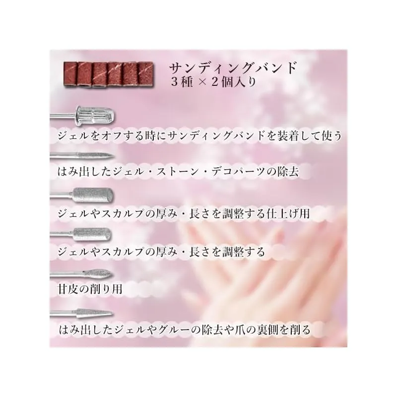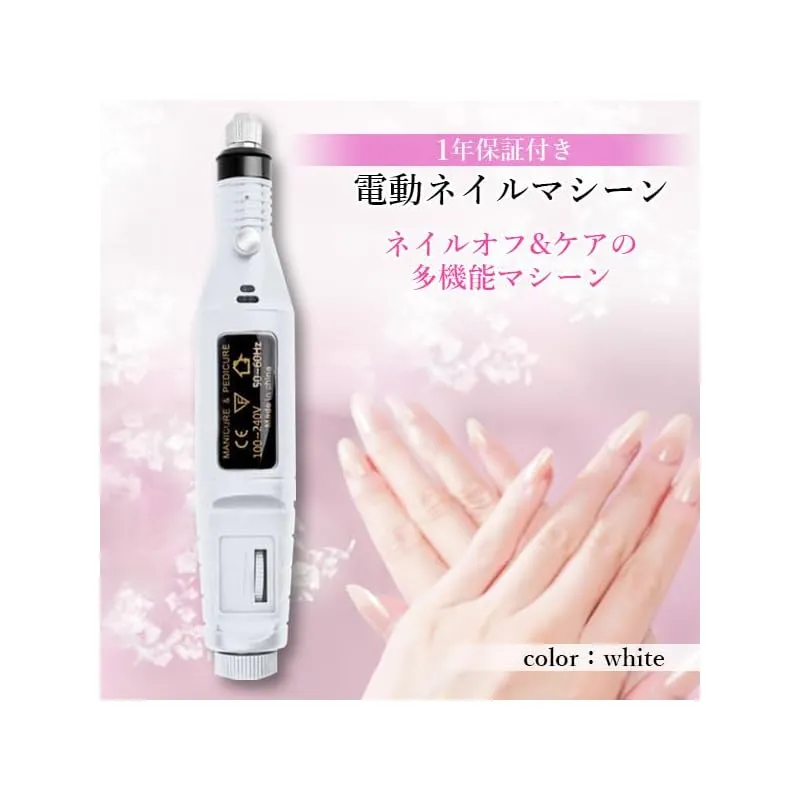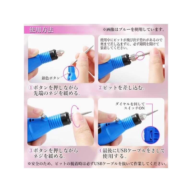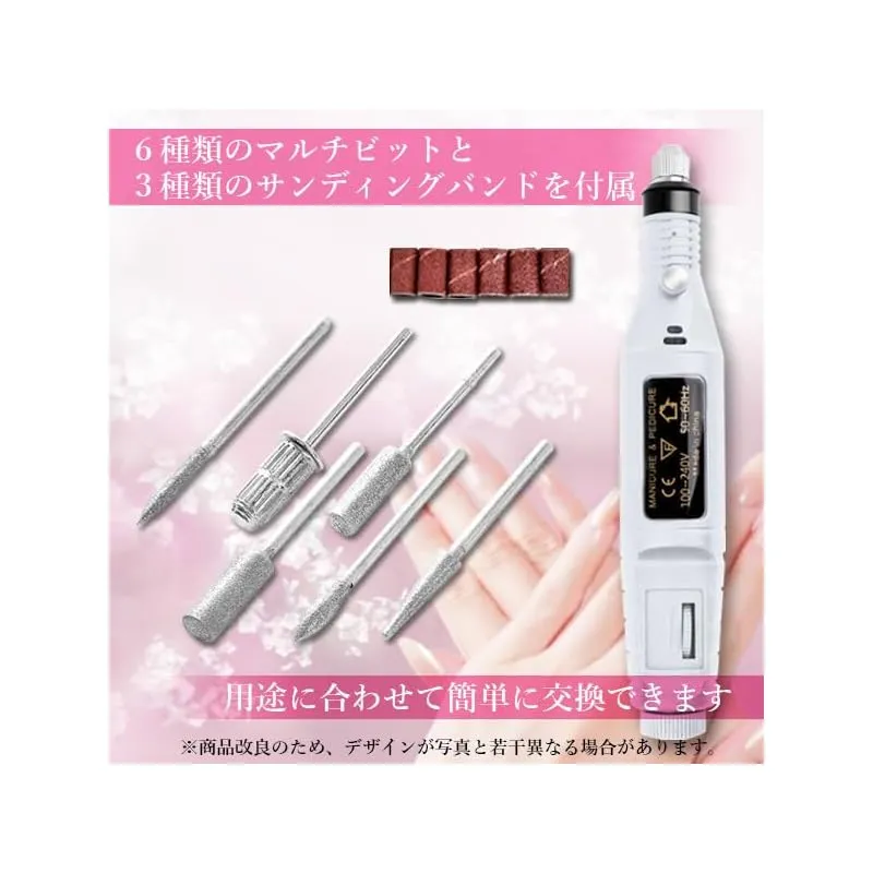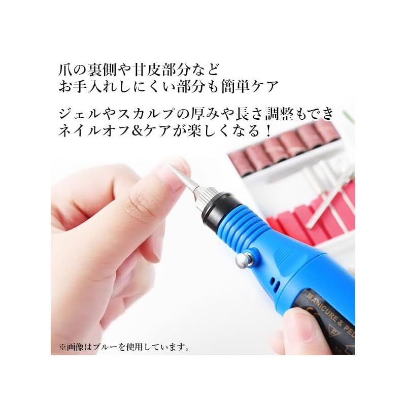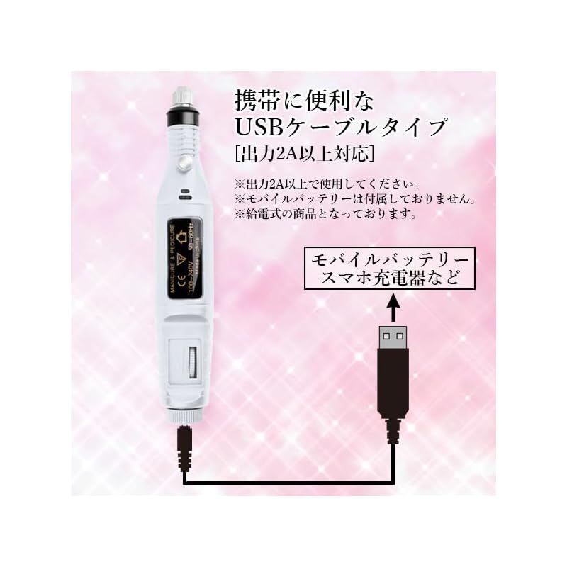 ・ネイルオフ&ケアの多機能電動ネイルマシーン ・携帯に便利なUSBケーブルタイプ(出力2A以上対応) ・6種類のマルチビットと3種類のサンディングバンド付属で用途に合わせて簡単に交換できます ・爪の裏側や甘皮部分などお手入れしにくい部分も簡単ケア ・ジェルやスカルプの厚みや長さ調整もできネイルオフ&ケアが楽しくなります ・最高20000回転/分 の調節可能 ・本体が熱くなりにくい放熱設計