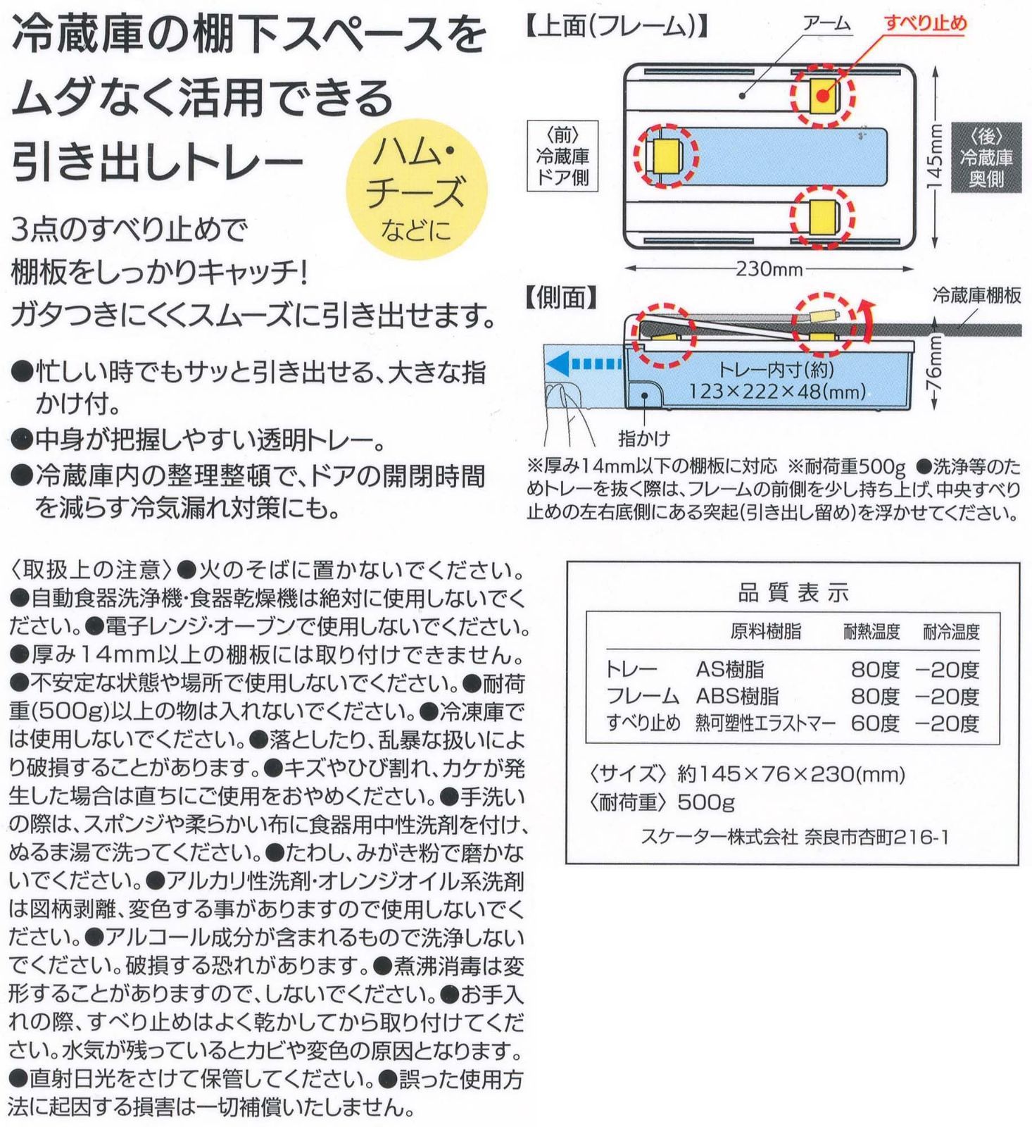 スケーター (skater) 冷蔵庫棚下引き出しトレー スリムタイプ 冷蔵庫の棚下スペースをムダなく活用できる KTRS1-A