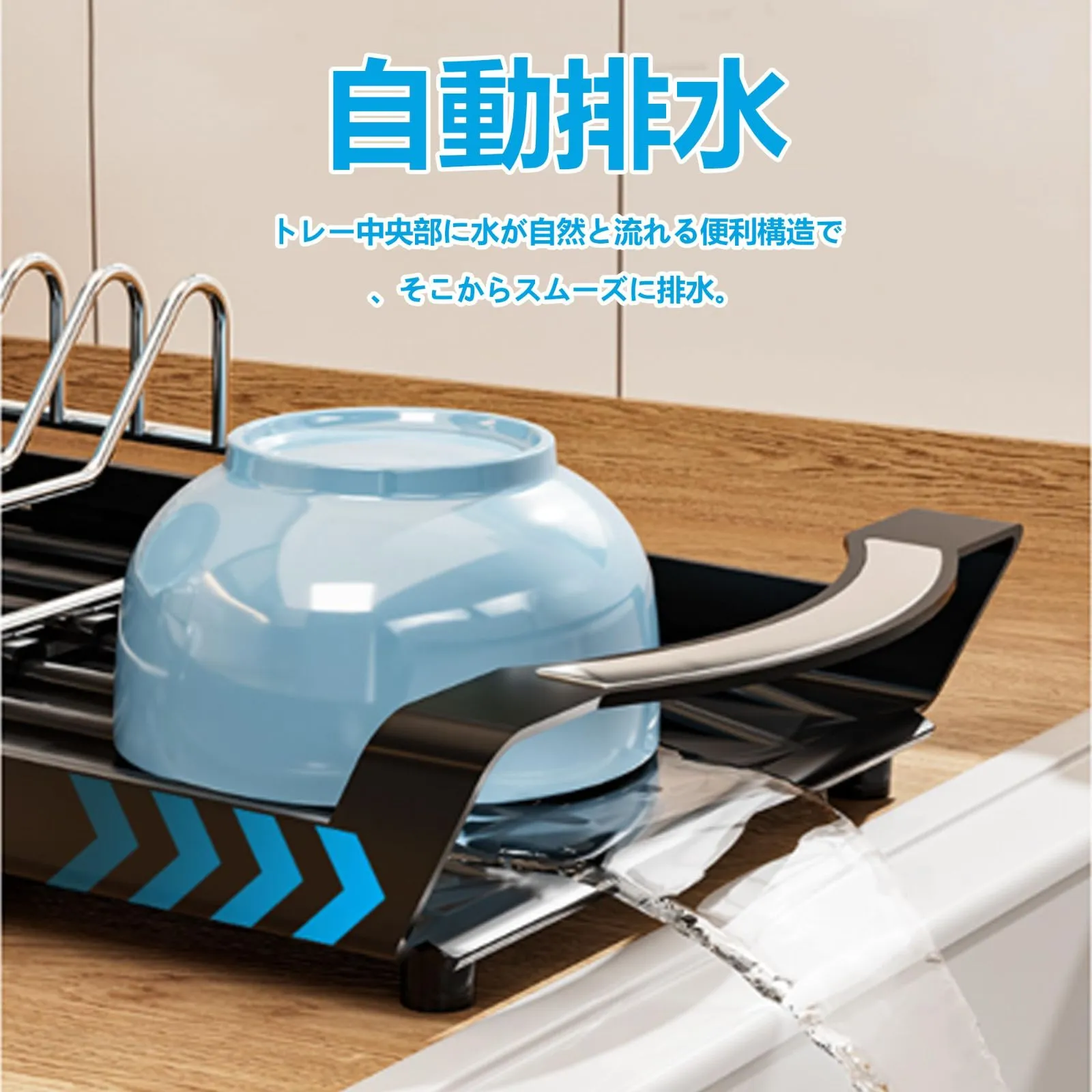 【自動排水】絶妙な傾斜の付いたトレイから水が直接シンクに流れる仕組みになっています。手間いらずで効率よく水切りができ、キッチンを常に清潔に保ちます。
