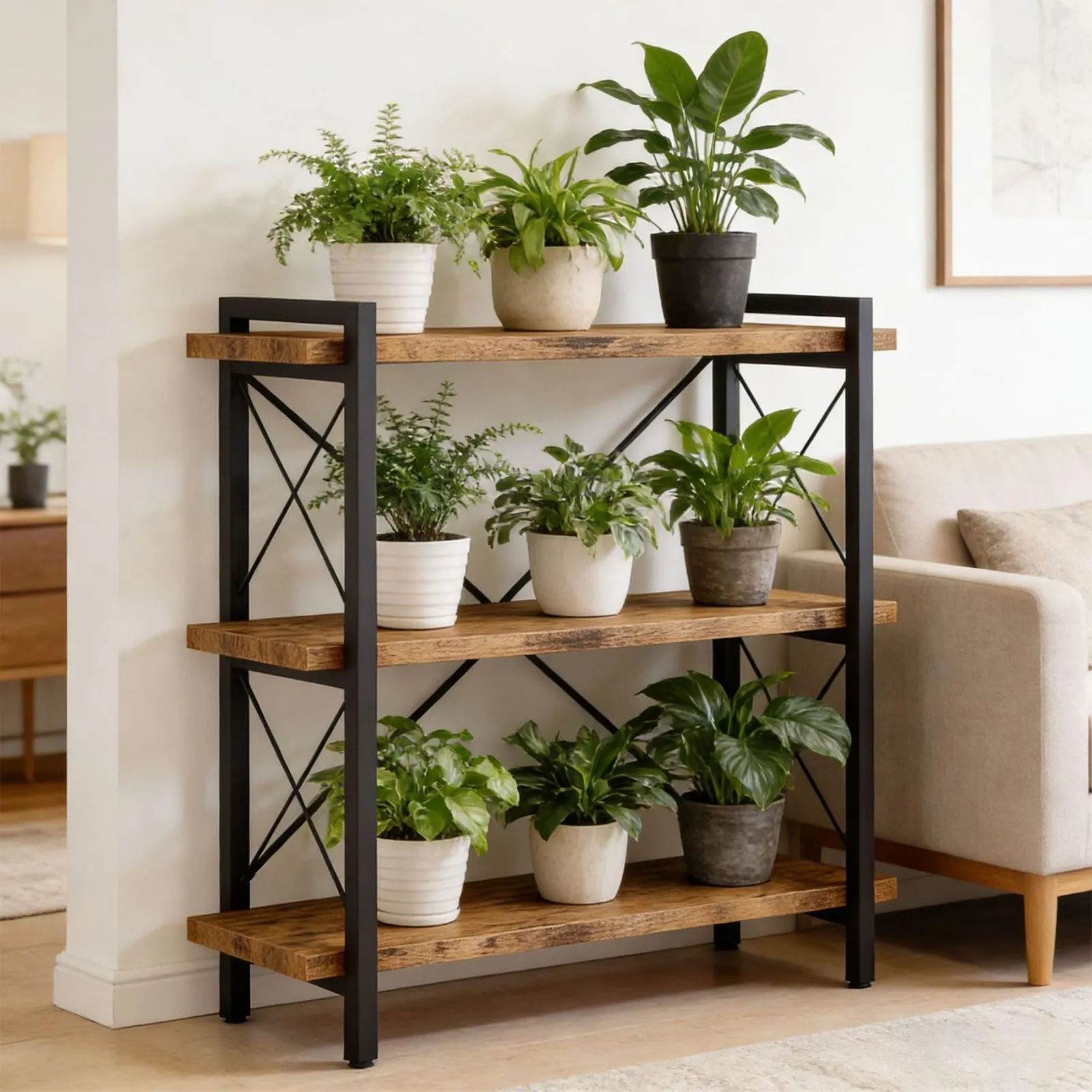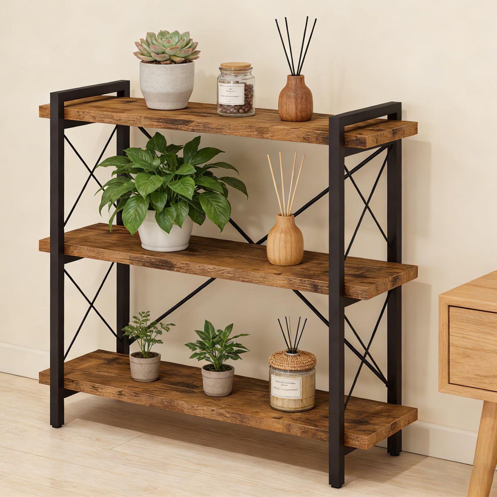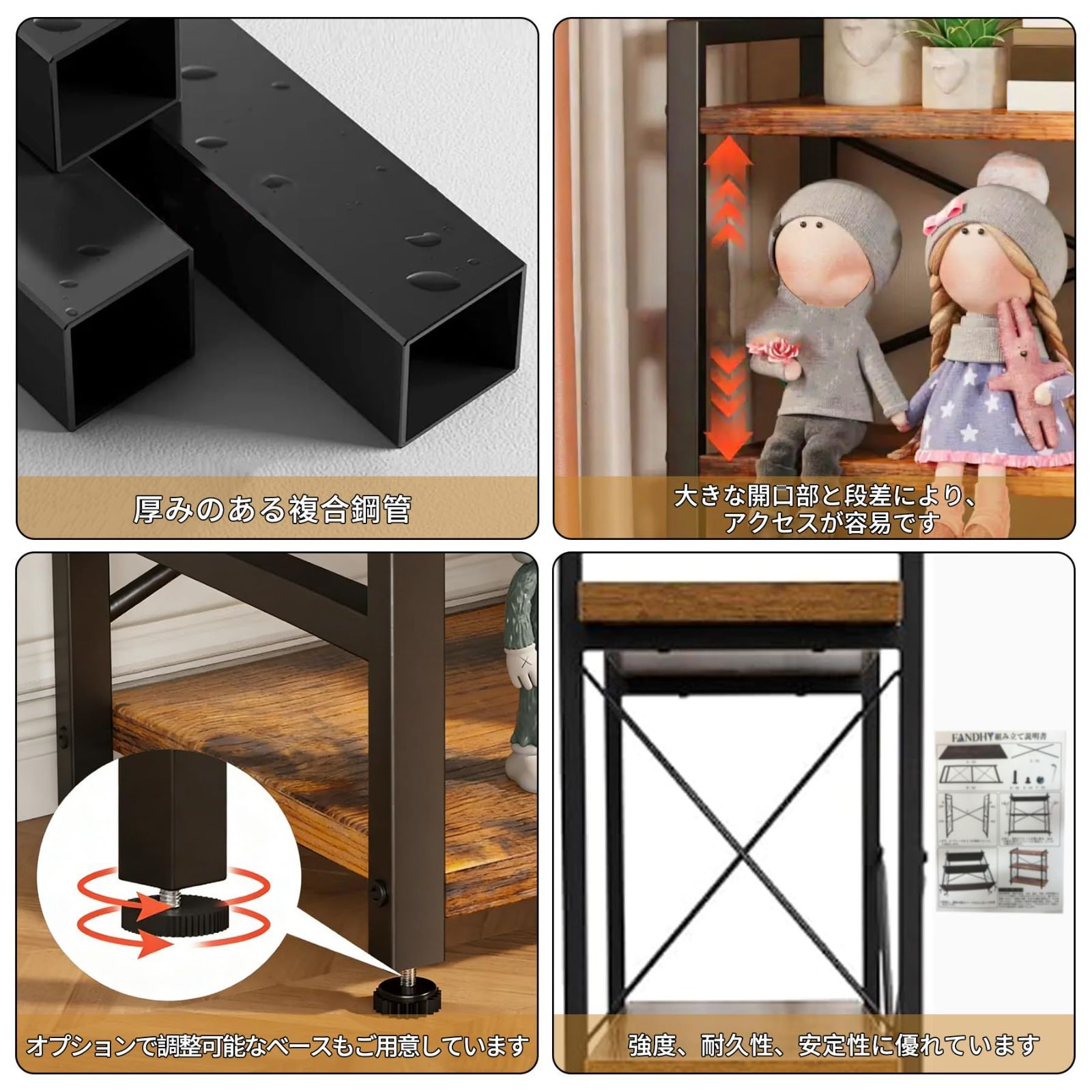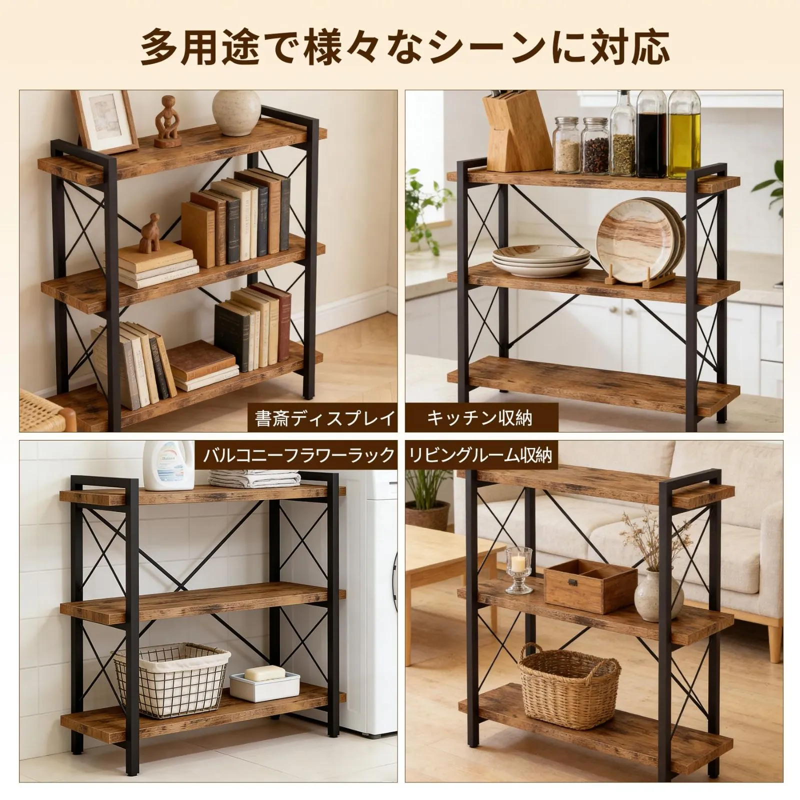 【シンプルなオープンシェルフ】このオープンシェルフユニットは、美しい木目と頑丈な金属フレームを組み合わせ、耐久性と機能性を兼ね備えています。背面のX字型のクロスバーが安定性を高めています。
