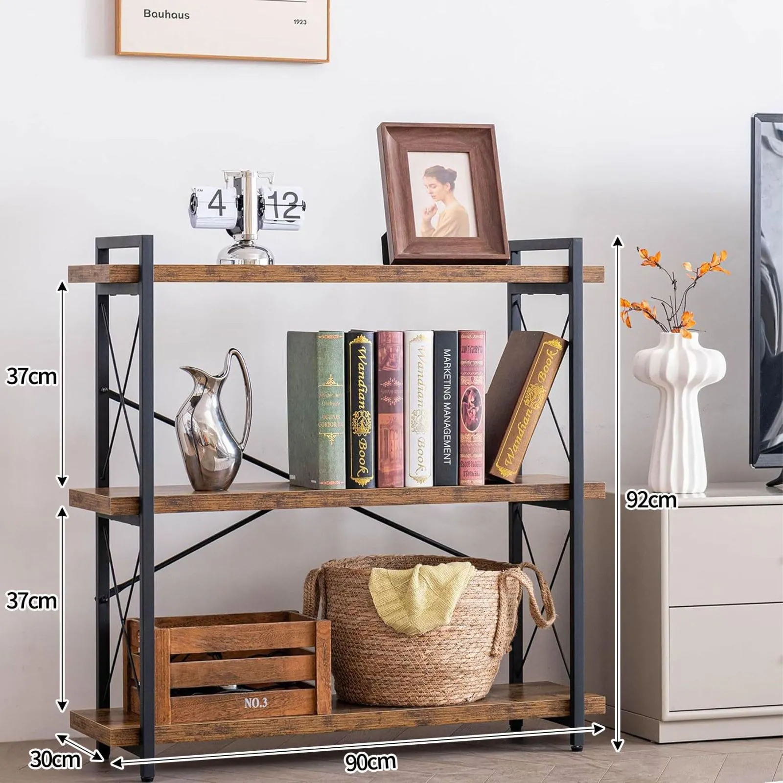 製品寸法:幅90cm×奥行30cm×高さ91cm。重量:約9kg。棚の高さ:36cm。材質:中密度繊維板とスチール。カラー:アンティークウッド。フォトアルバム、家庭やオフィスの装飾品、バーガンディ色のアイテム、書籍、食品、小さな装飾品などの収納に最適です。