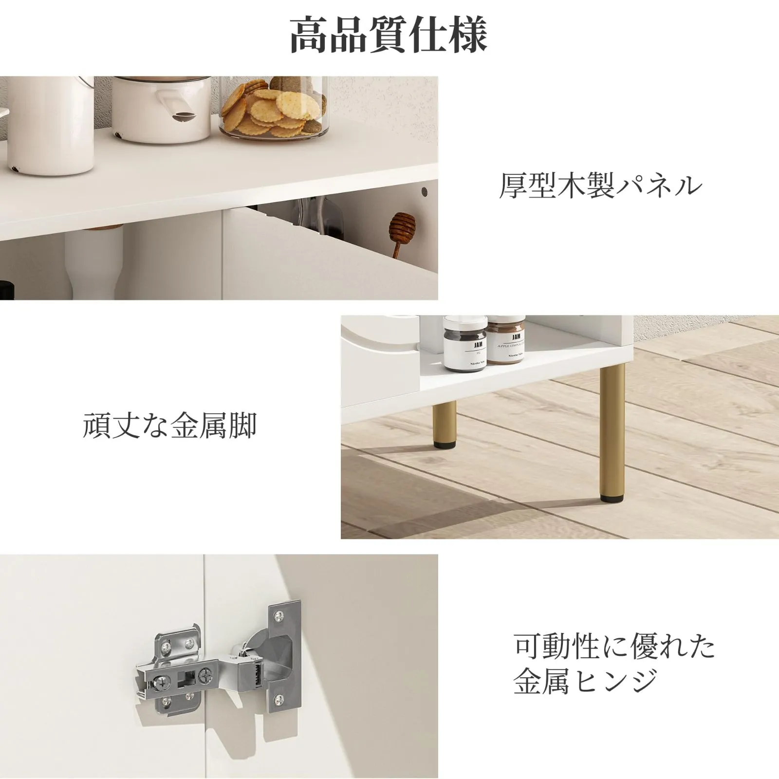 【ストレスフリーな使い心地】可動性に優れたフレキシブル金属ヒンジ 耐久性の高い金属製ヒンジを採用。キャビネットの扉がスムーズに開閉し、隣接する家具や壁を気にせず効率的に空間を活用できます。日常の使用にさらなる快適さを提供します。