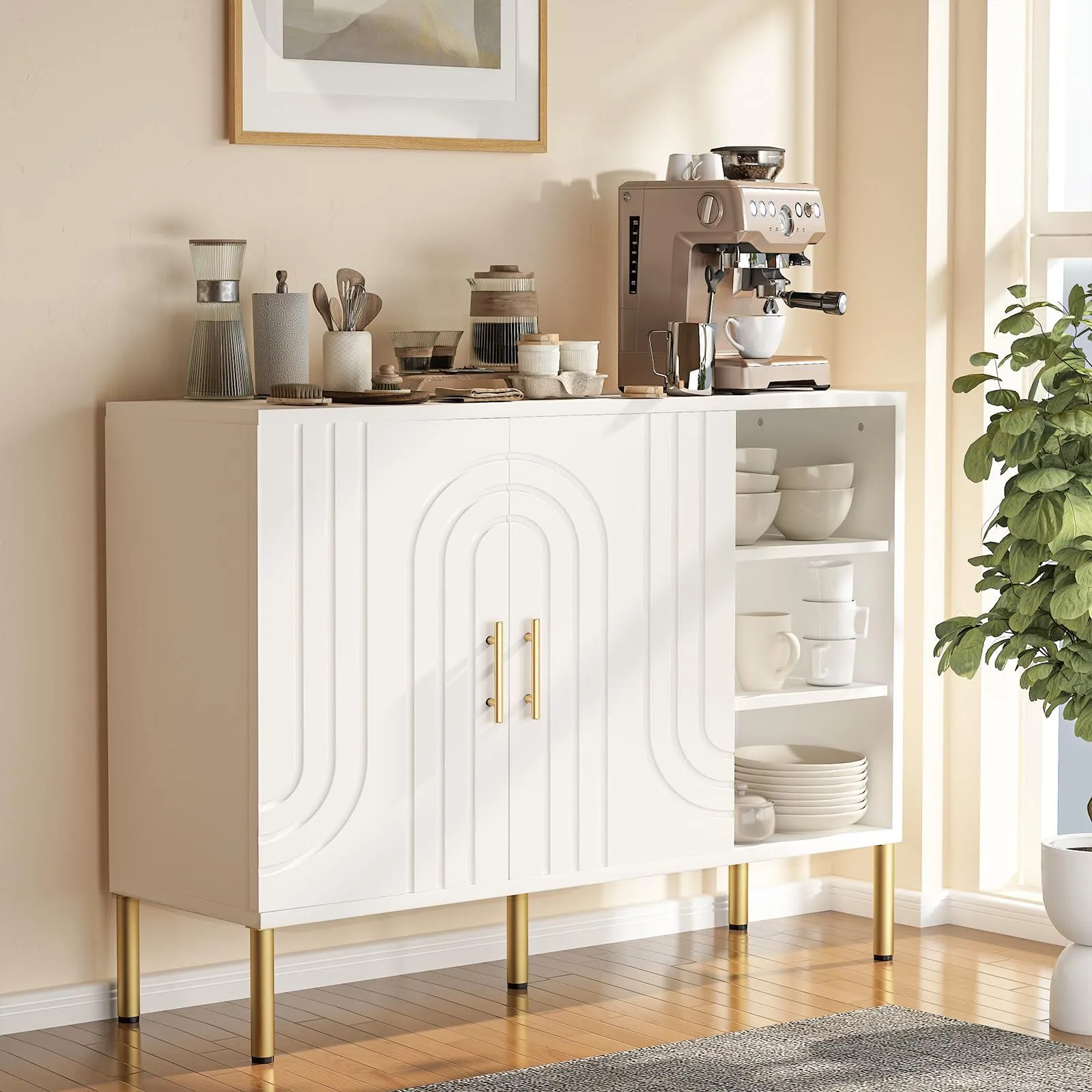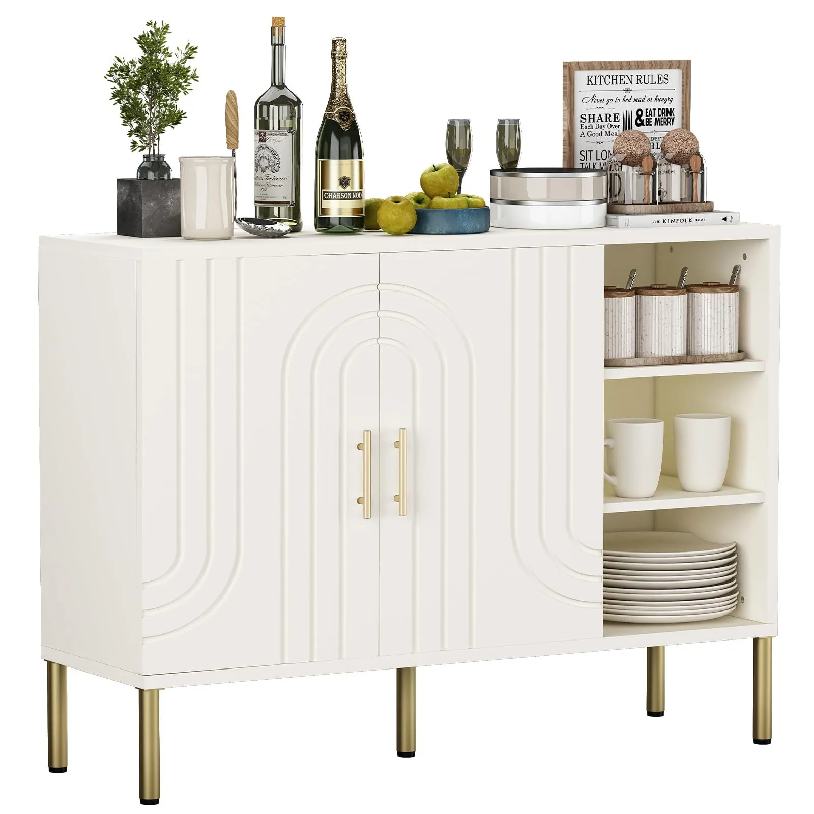 バッフェ収納キャビネット、曲線テクスチャーの多機能サイドボード、木製キャビネット(扉2枚・3段棚付き)、リビング・キッチン・玄関用サイドテーブル、クリーム色、110×35×82cm