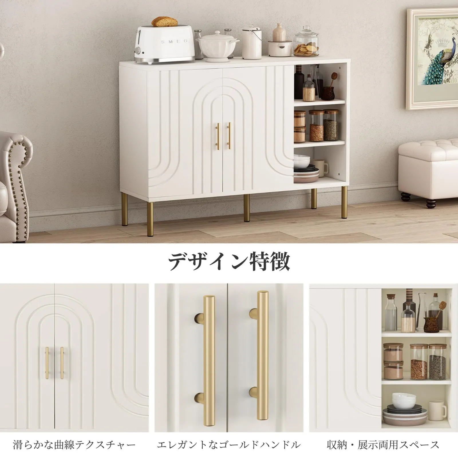【上質なデザイン】滑らかな曲線テクスチャーとエレガントなゴールドハンドル 角を抑えた優雅な曲線デザインが、モダンな空間にしっくりと溶け込みます。アクセントとなるゴールドハンドルが高級感をプラス。機能性と美観を両立したインテリアアイテムです。