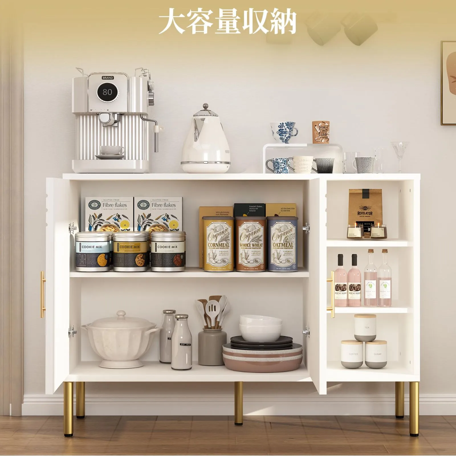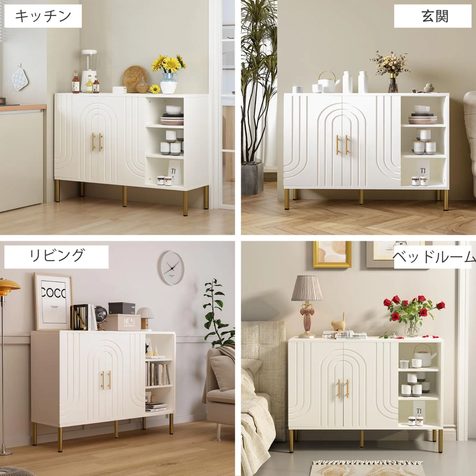 【大容量&多用途収納】キッチン、リビング、寝室などあらゆる空間にマッチ スムーズに開閉する扉の内側は広々とした収納スペース。食器、リネン、日常雑貨の整理に最適です。玄関では靴箱や小物収納としてもご利用いただけ、一台で家中の整理整頓をサポートします。