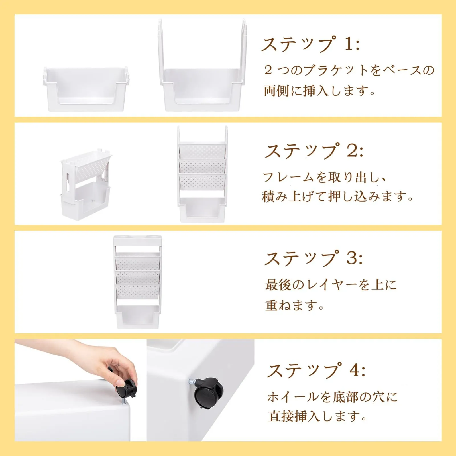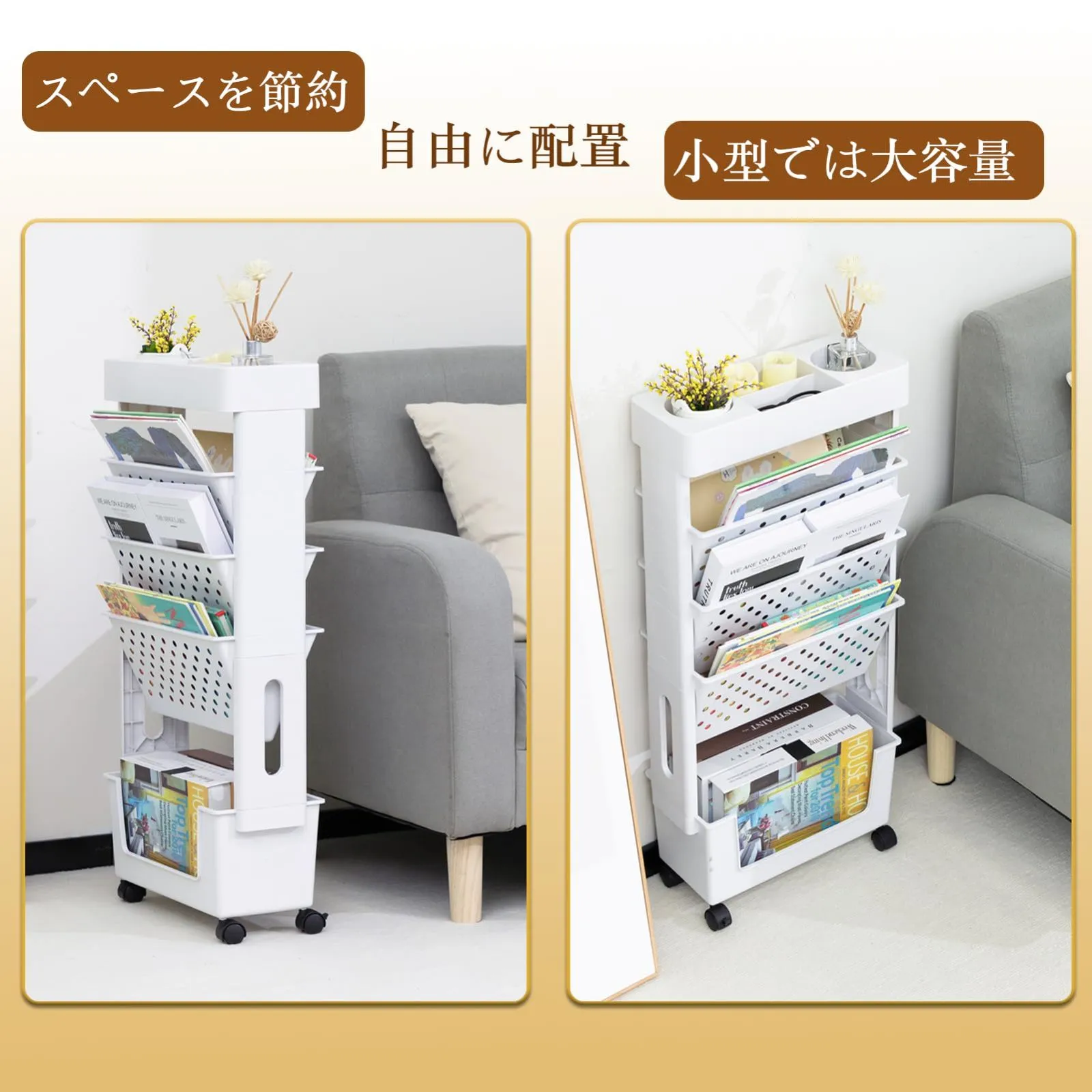 超スリム設計で隙間を有効活用!横幅わずか約15cmの薄型デザイン。机の横・キッチン・洗面所などの狭いスペースにピッタリ収まります。