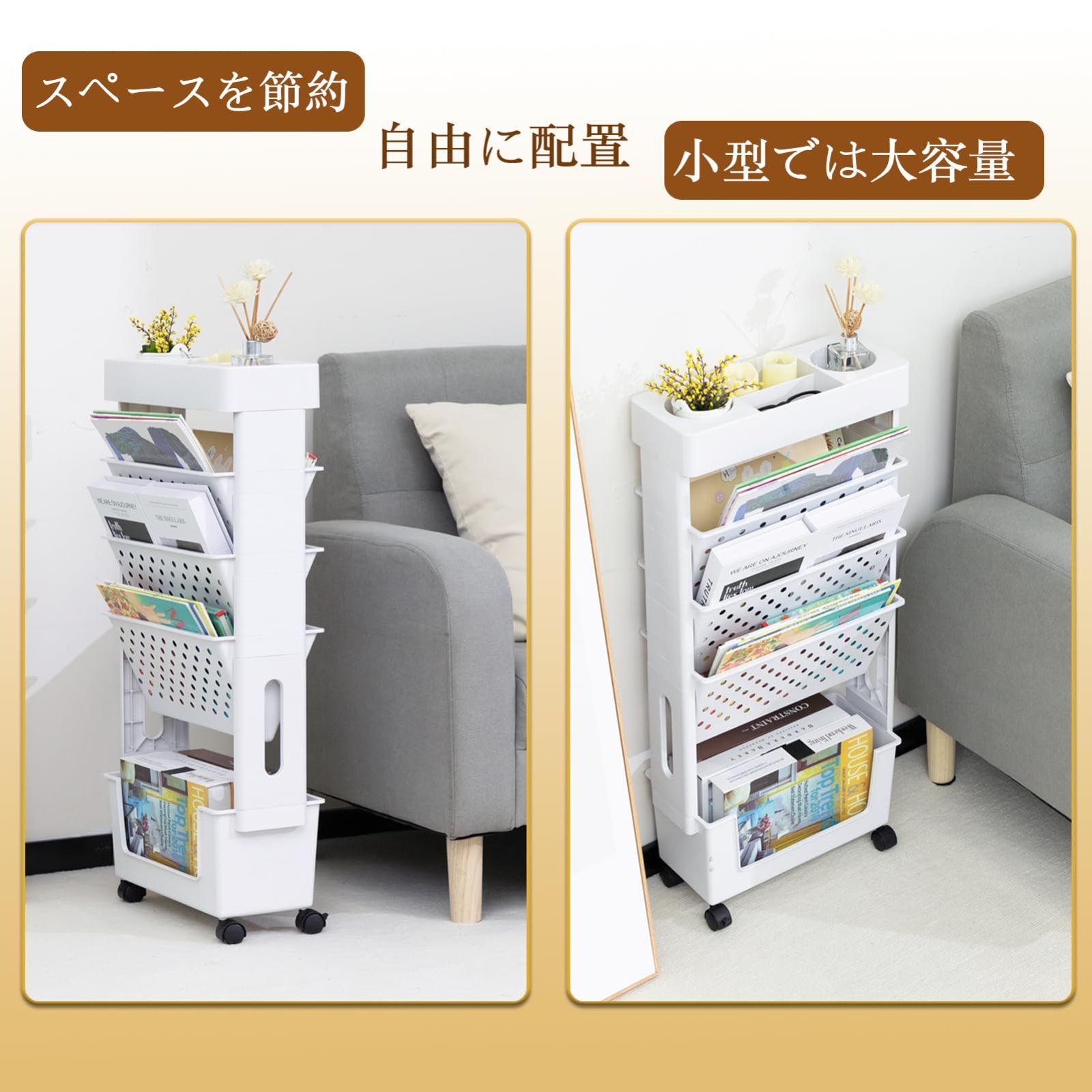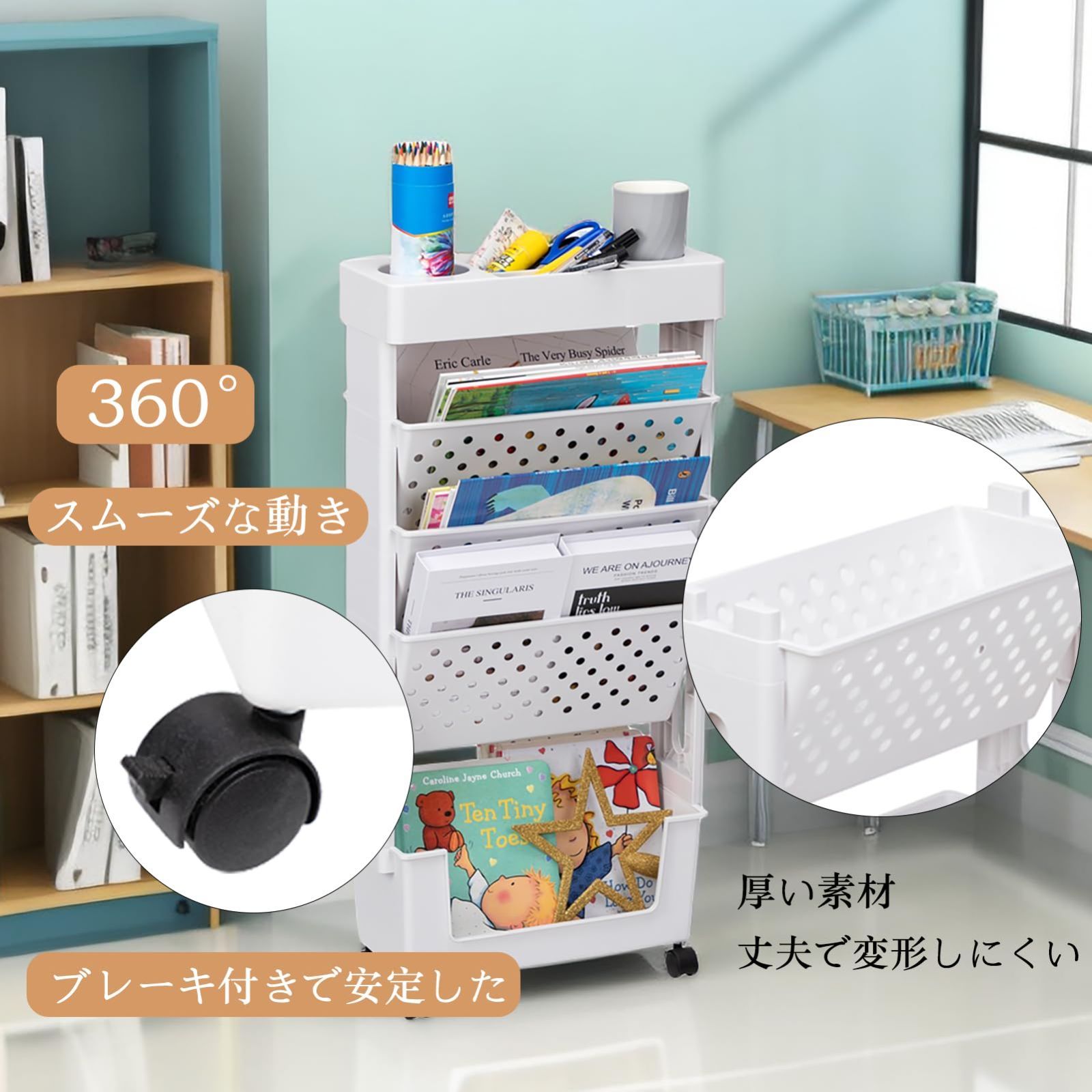 ALIMORDEN 本棚 隙間収納 デスクワゴン 5段 キャスター付き 可動式 引き出し マガジンラック 収納ラック キッチン オフィス 子供ブックスタンド 本/CD収納 大容量 省スペース 軽量 組み立て簡単 ホワイト