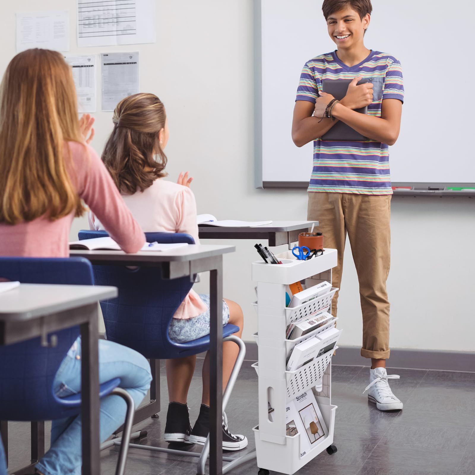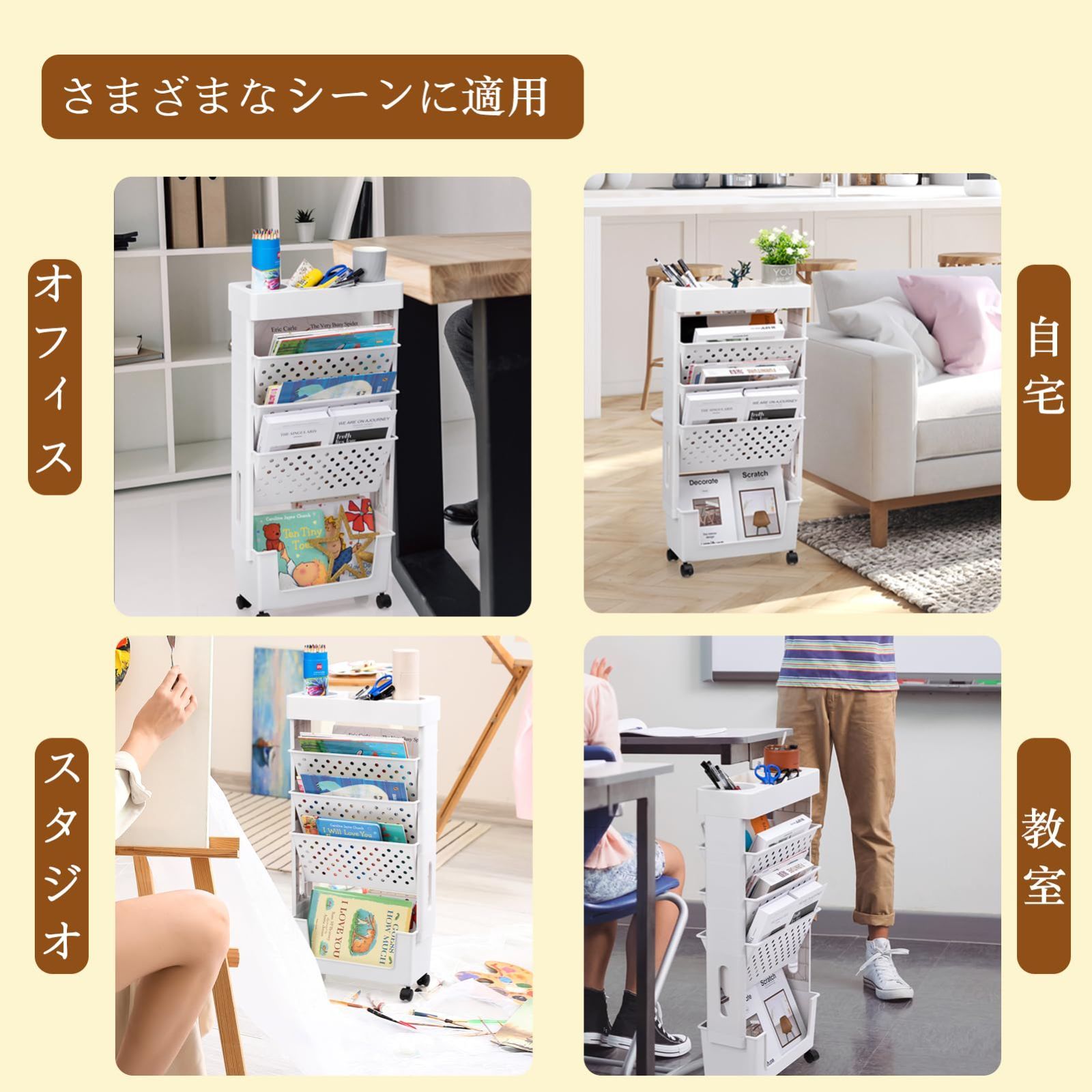 オフィスはともかく、学校、リビングなどいろんな場面で使用可能、文房具、雑誌やCDなどたくさんの日用品を収納できます。