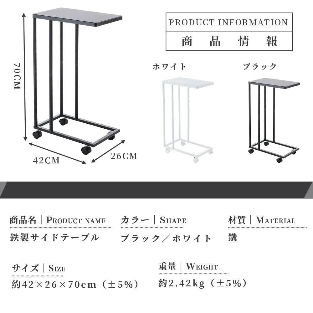 商品名:鉄製サイドテーブル カラー:ブラック/ホワイト 材質:鉄 サイズ:約42×26×70cm(±5%) 重量:約2.42kg(±5%)