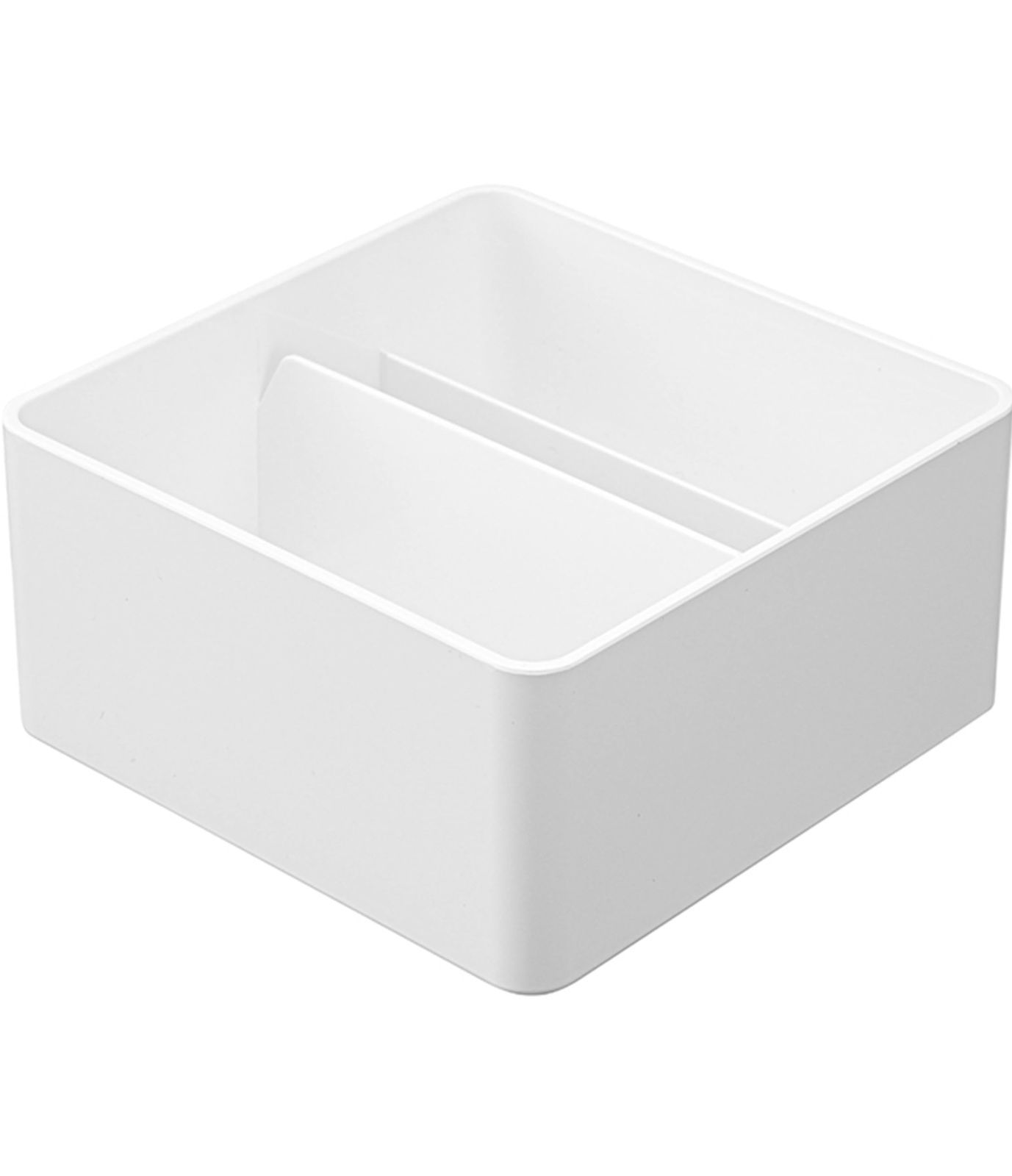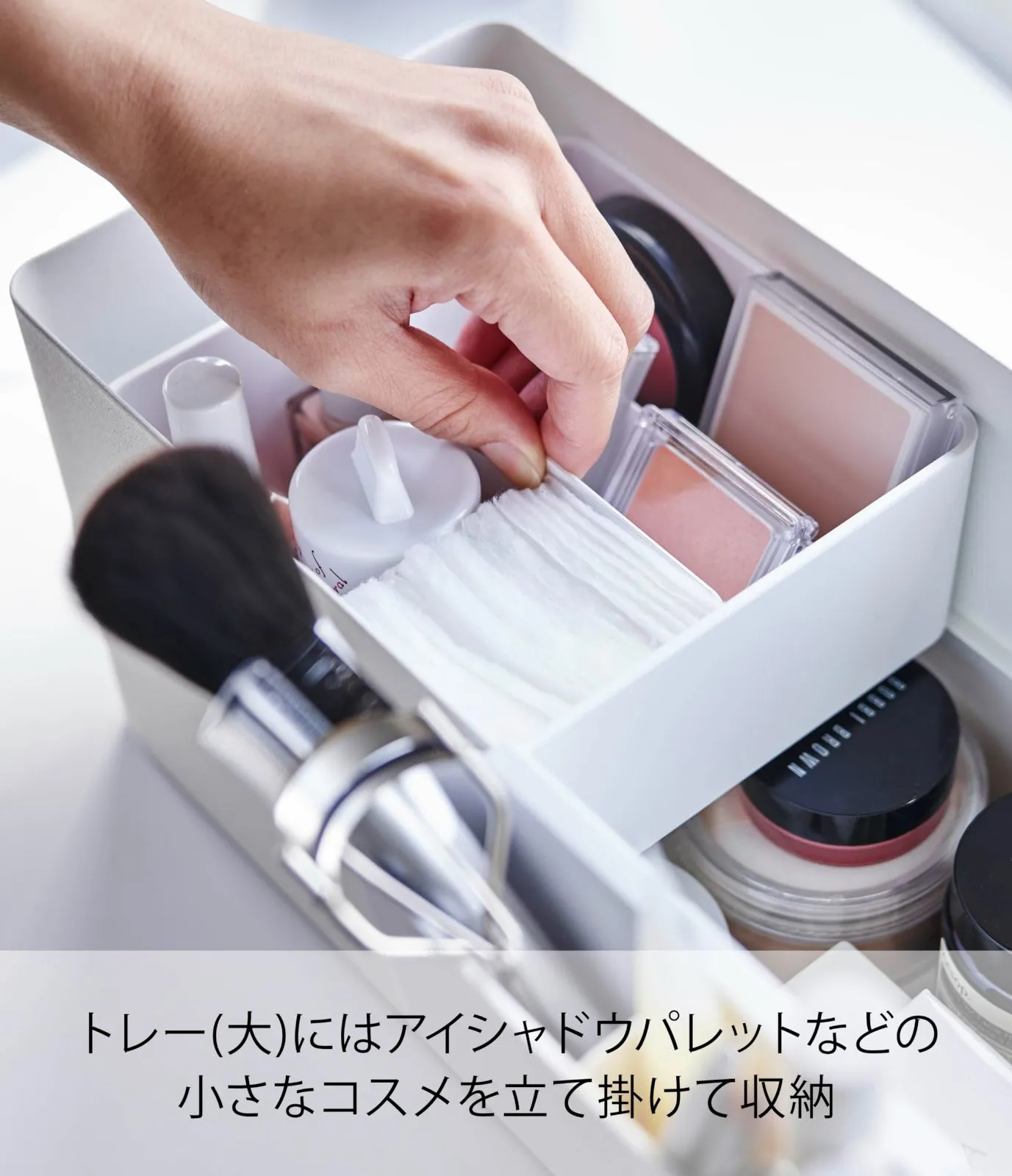 パレットなどの小さなコスメを立て掛けて収納できるトレー(大)とペンなどの細長いコスメを立てて収納できるトレー(小)が付いています。
