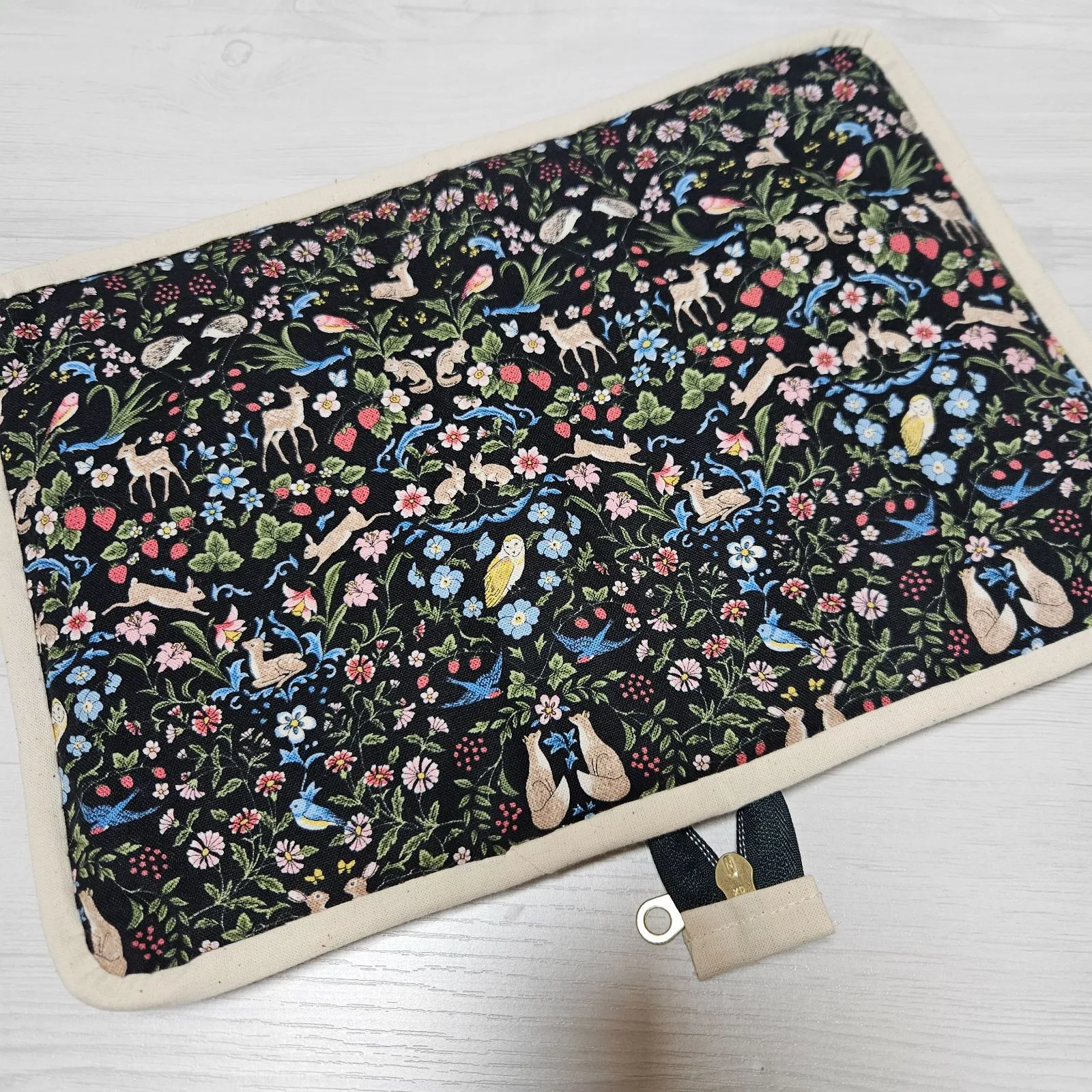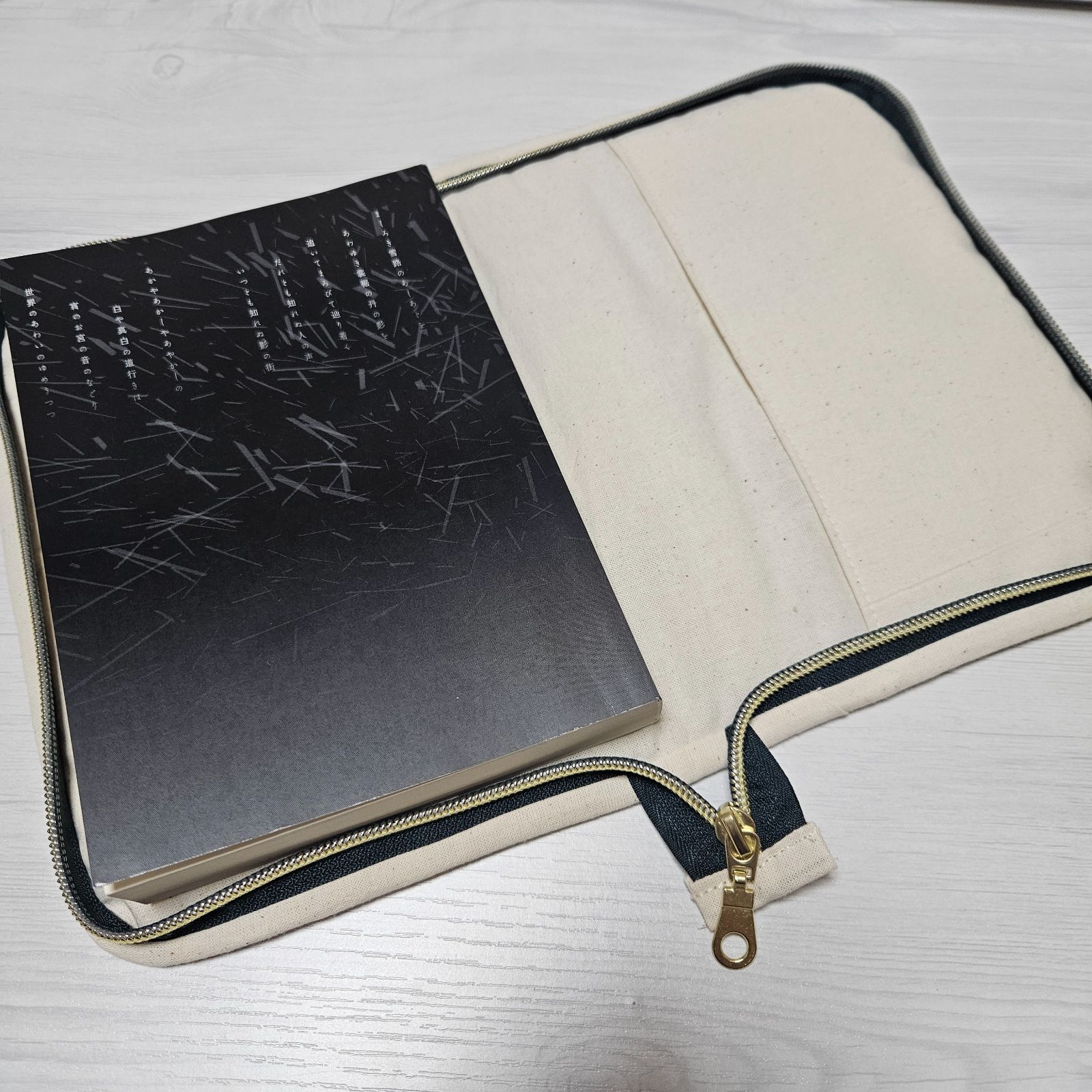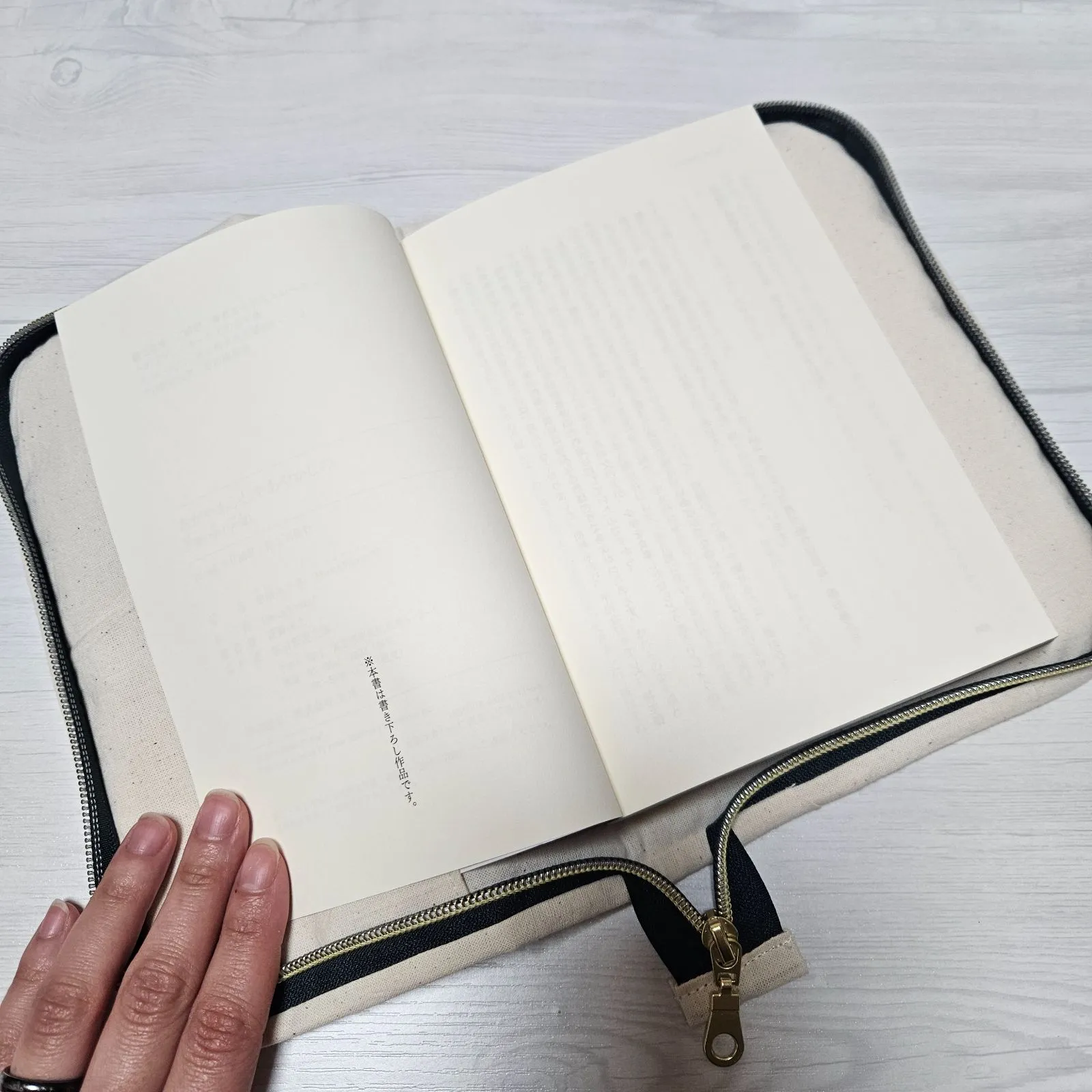 【特徴】 外周ファスナー付きで、カバンに入れた際などにページが傷ついてしまうのを防止できます。 キルト芯をはさんでいるので、程よい厚さふわふわの手触りとなっております。