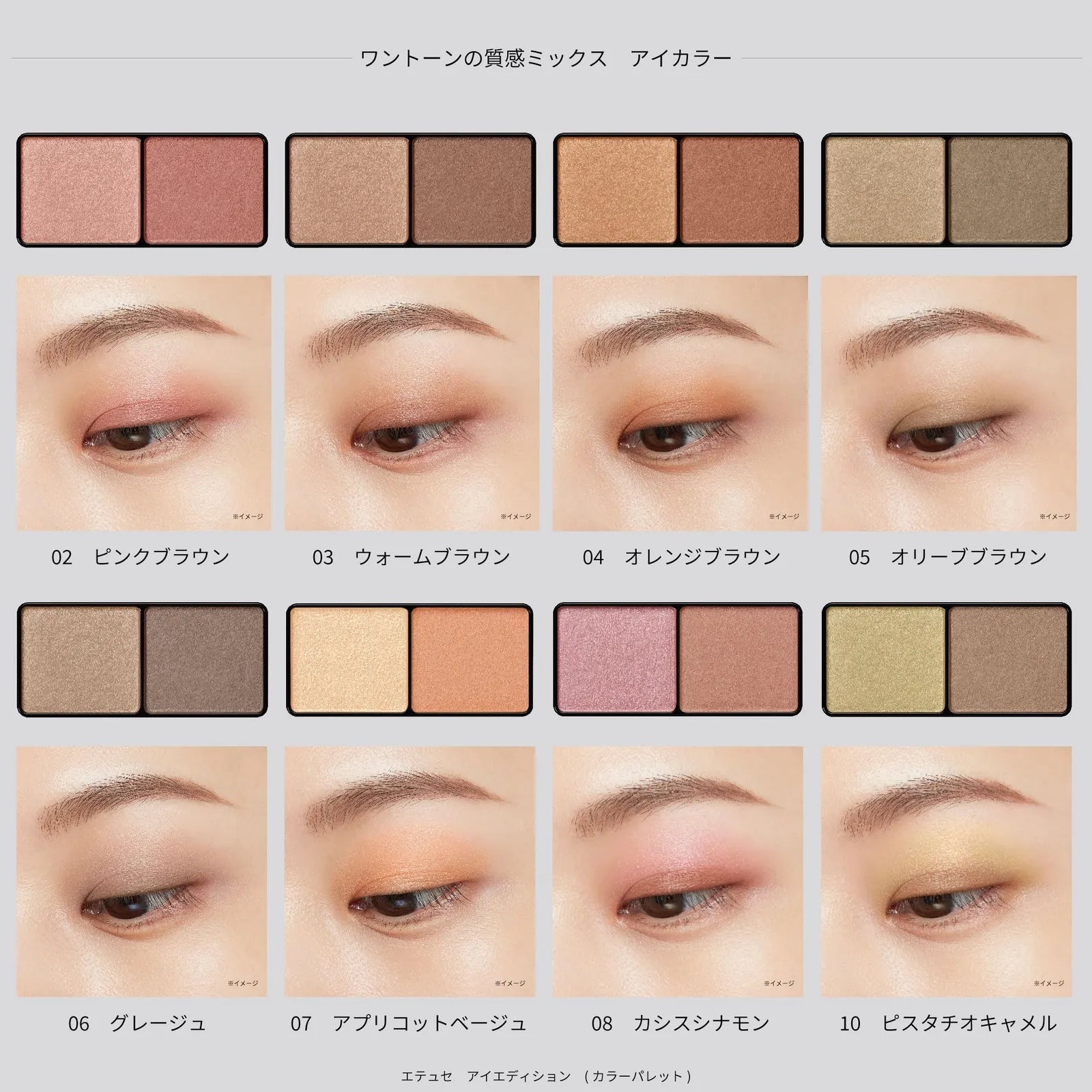 2つの質感で、 目もとに深みを演出する デュオアイシャドウツヤとマット、2つの質感で、肌になじみながらも目もとをナチュラルに大きく仕上げる