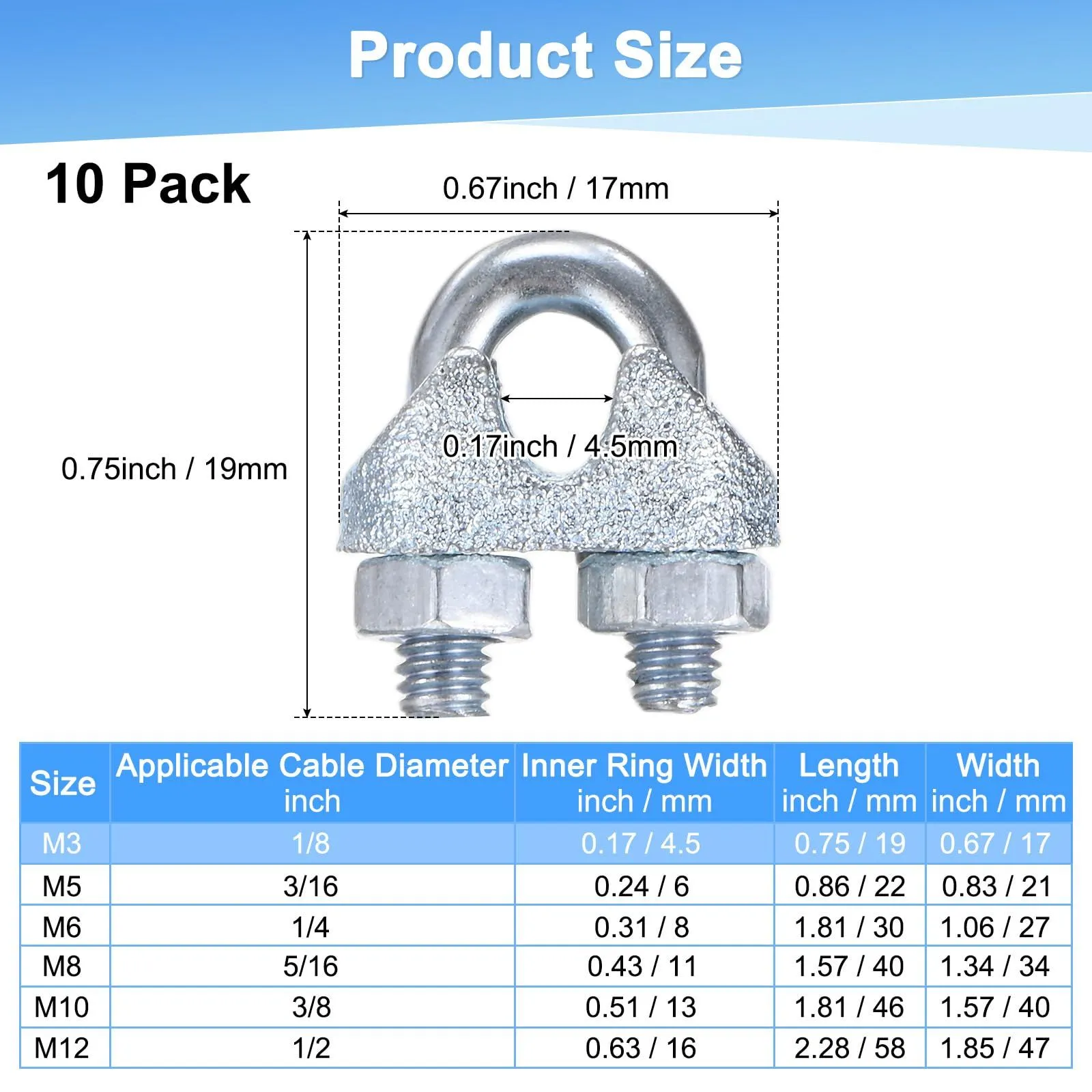 10パックのケーブルクランプ、M3炭素鋼1/8ワイヤーロープクリップスリンブルUボルトサドルファスナー、ケーブルリギング/セーリング/物干し用、ワイヤークランプ