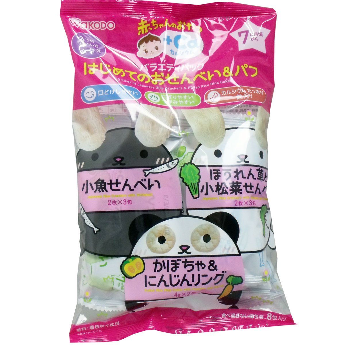 お子さまの月齢に合った口どけ・固さ・味付けに配慮し、にぎりやすい、つまみやすい形状にしたママも安心してあげられる鉄やカルシウム入りのおやつシリーズです。おせんべいとパフリングのバラエティパックです。3つの味が楽しめます。育ちざかりのお子さまにあげたい栄養素を配合し。食べ過ぎの心配がない個包装です。