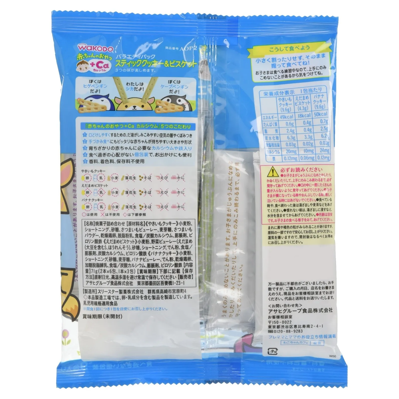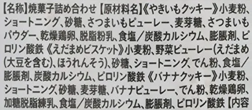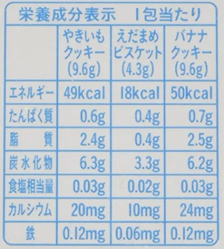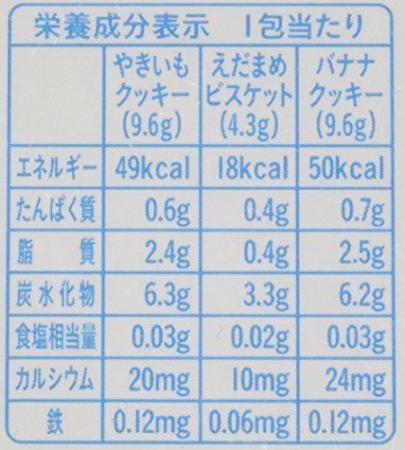 《やきいもクッキー》小麦粉、ショートニング、砂糖、さつまいもピューレー、麦芽糖、さつまいもパウダー、乾燥鶏卵、脱脂粉乳、食塩/炭酸カルシウム、膨脹剤、ピロリン酸鉄 《えだまめビスケット》小麦粉、野菜ピューレー(えだまめ(大豆を含む)、ほうれんそう)、砂糖、ショートニング、でん粉、食塩/膨脹剤、炭酸カルシウム、ピロリン酸鉄 《バナナクッキー》小麦粉、ショートニング、砂糖、麦芽糖、バナナピューレー、でん粉、乾燥鶏卵、加糖脱脂練乳、食塩/炭酸カルシウム、膨脹剤、ピロリン酸鉄