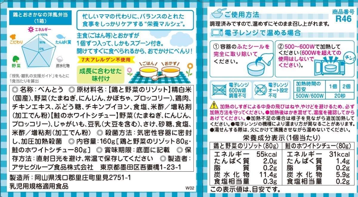 忙しいママの代わりにバランスのとれた食事をしっかりケアする"栄養マルシェ"シリーズです。お皿いらずで便利なカップタイプ。容器はそのまま食器として使え、さらに使い捨てのスプーン付きなのでお出かけにも便利です。具の野菜は100%国産です。7大アレルゲン不使用商品は全30品のうち16品。