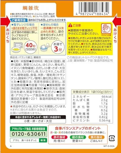 【区分3:舌ででつぶせる】 原材料・成分 精白米(国産)、鶏卵、野菜(にんじん、はくさい、青ねぎ)、イヌリン(食物繊維)、たい、白だし(小麦・さば・大豆を含む)、牛コラーゲンペプチド、たいエキス、植物油脂、昆布エキス、食塩、米酢/増粘剤(キサンタン)、調味料(アミノ酸等)、酸化防止剤(V.E)、V.B1 ご注意(免責)>必ずお読みください ---
