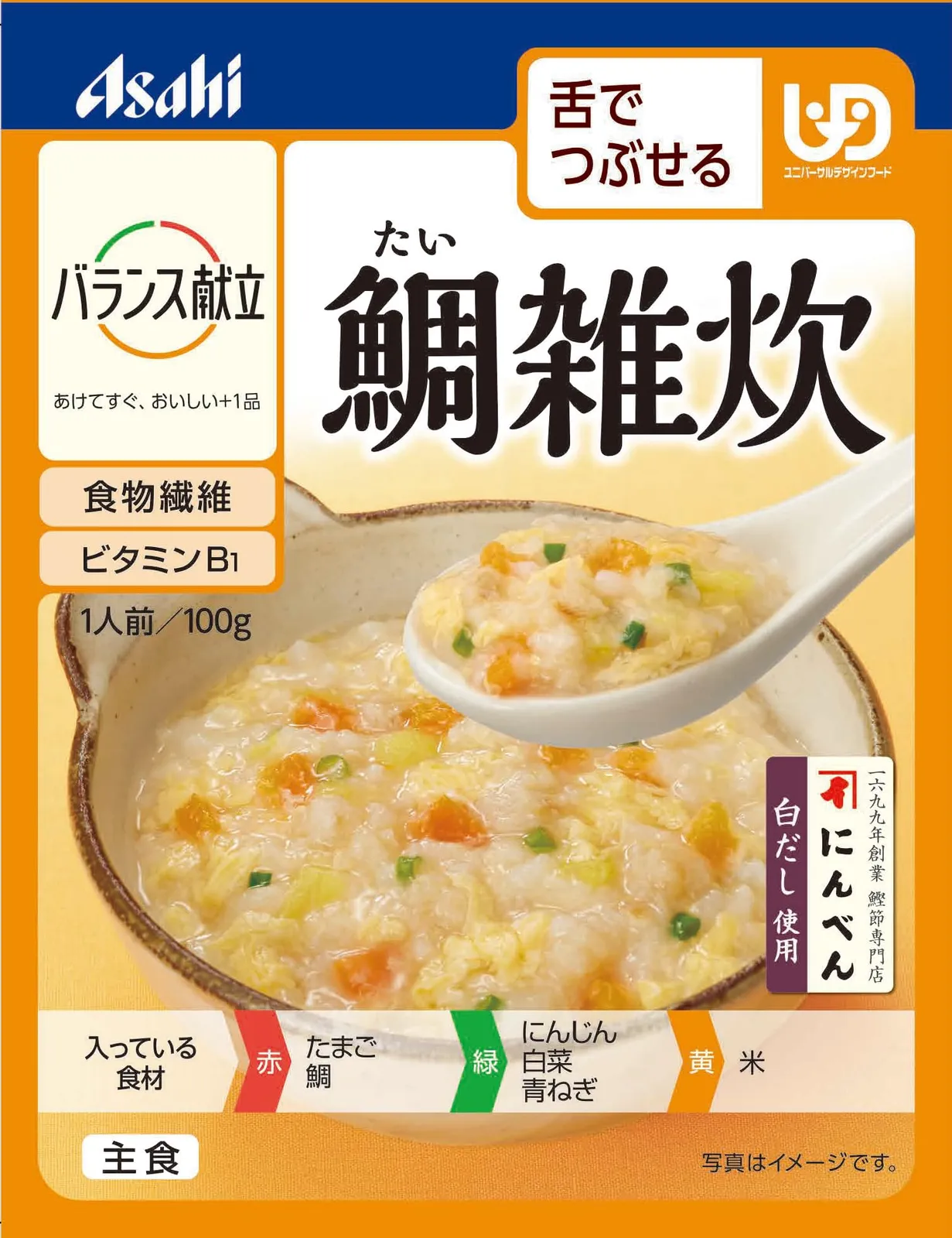 商品紹介 鯛と昆布の風味を利かせ、にんじん・白菜・青ねぎとかき卵で仕上げました。にんべん「白だし」使用。 ユニバーサルデザインフード 認定商品