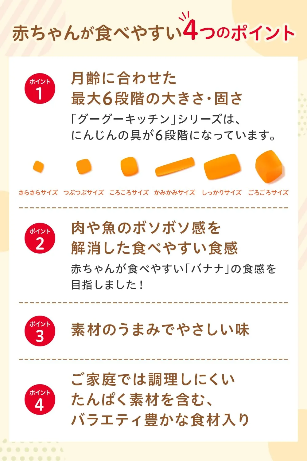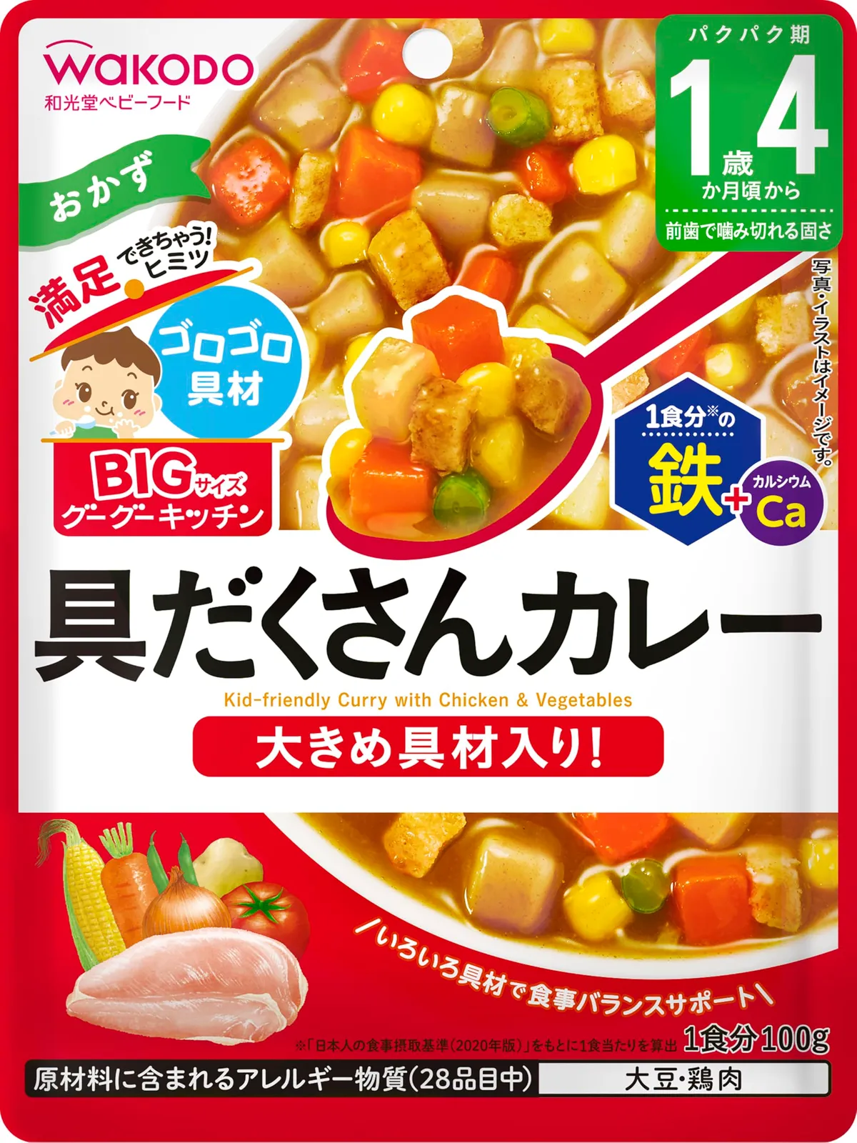 【商品特長】 ・トマトでマイルドに仕上げたカレーです。鶏肉と野菜のうまみが溶け込んでいます。 ・1食分の鉄入り。カルシウムも一緒に摂れ、離乳食で不足しがちな栄養を手軽にサポートできます。 ・着色料、香料は使用しておりません。