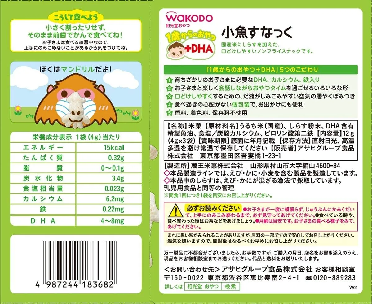 育ちざかりのお子様に必要なDHA・鉄・カルシウム入り。楽しいいろいろな形で、お子様とコミュニケーションを楽しめるおやつシリーズです。口どけ、固さ・味付けにも配慮しています。国産米にしらすを加えた、口どけしやすいノンフライスナックです。パッケージのどうぶつ部分が切りとれてお子さまと楽しめます。