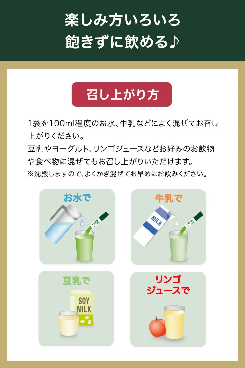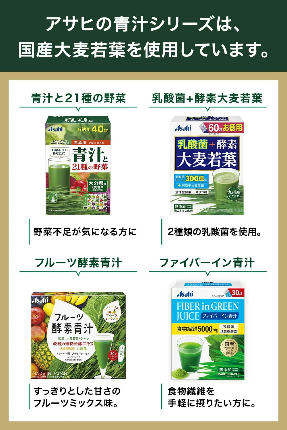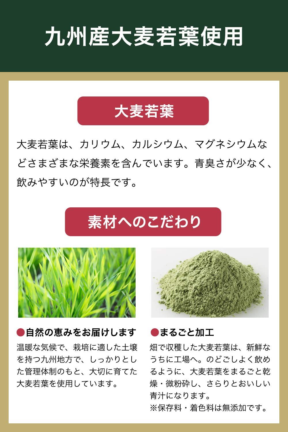 ・素材にこだわった国産大麦若葉。